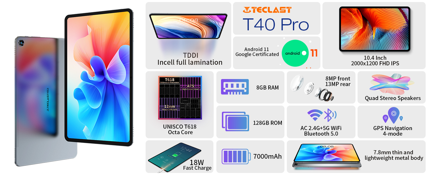 📶 【جهاز لوحي واي فاي 5G ومحمول】نظام تحديد المواقع المدمج والتصميم المعدني خفيف الوزن (يزن 1.05 رطل فقط) يتيح لك اصطحابه إلى أي مكان. تم تجهيز جهاز T40 PRO Tablet مقاس 10 بوصات بشبكة WiFi مزدوجة النطاق 2.4G+5G وBluetooth 5.0، مما يجعل الجهاز اللوحي يظل متصلاً بالشبكة اللاسلكية في أي وقت. ستكون هدية رائعة لعائلتك أو أصدقائك أو أطفالك. نقدم خدمة ضمان لمدة 12 شهرًا، إذا كنت بحاجة إلى دعم فني، فيرجى الاتصال بخدمة عملاء TECLAST.