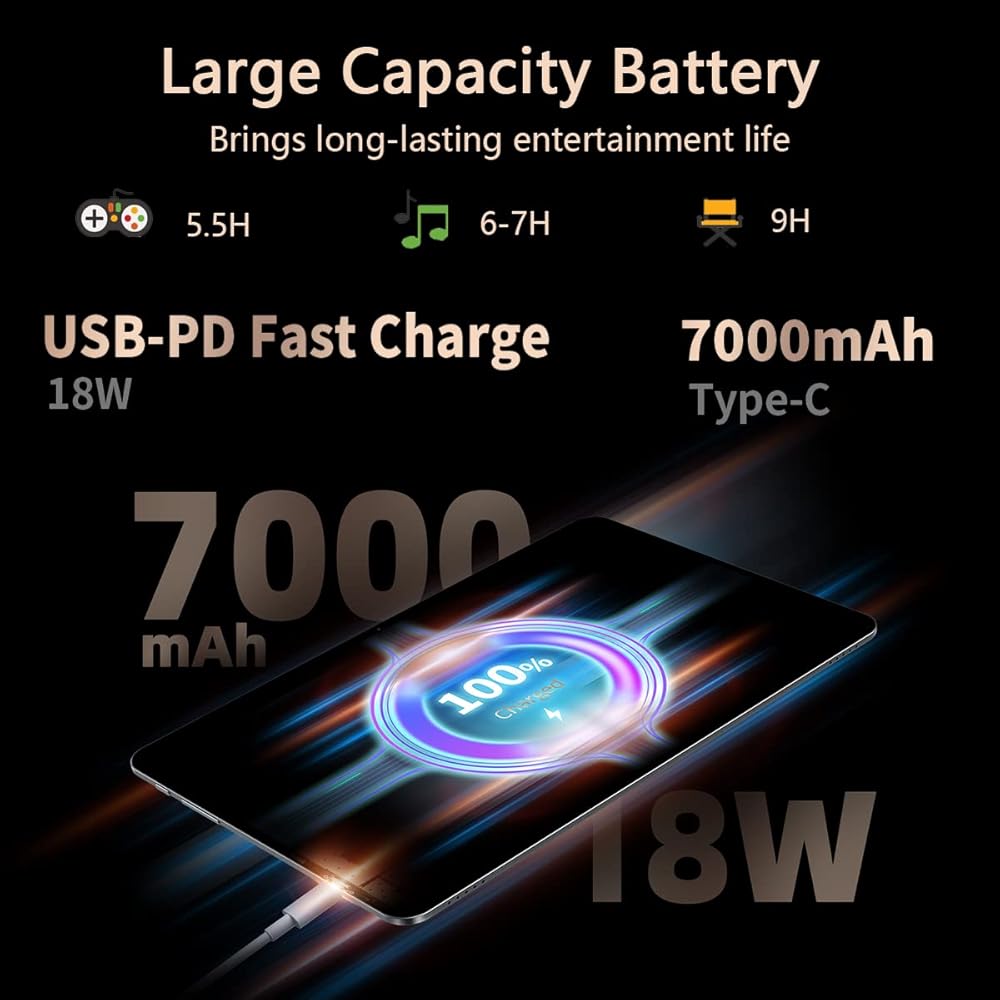 🔋【Android 11 وشحن سريع】يتميز بأحدث نظام Android 11 ومعتمد من GMS، ويحمي جهاز Teclast اللوحي خصوصيتك، ويمنحك التحكم في الإذن للوصول إلى التطبيقات الجديدة، ويعمل بشكل أسرع من Android 10. يمنحك متجر الألعاب المثبت مسبقًا وصولاً كاملاً إلى الخدمات مثل مثل Gmail، ويوتيوب، والخرائط. بطارية 7000 مللي أمبير مع شحن سريع 18 وات USB-PD عبر النوع سي، تسمح لك بإعادة شحن جهاز Android اللوحي طوال اليوم، مما يجعلها مثالية للألعاب والترفيه أو الأنشطة اليومية.