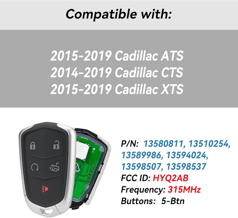 For Cadillac Escalade Key Fob Compatible With FCC ID: HYQ2AB. (315MHZ) For Full Complete List, Please Check Our Product Description. Each Remote Key replacement is Pre-Tested to Ensure Quality. This Remote Key replacement is compatible with 2015 2016 2017 2018 2019 2020 Cadillac Escalade Key Fob.