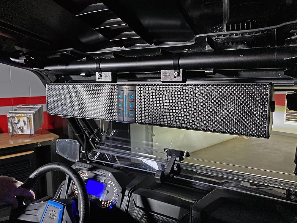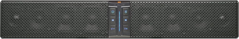 Introducing the Perfect Storm 27" Sound Bar by PowerBass®, the ultimate 8 speaker 300 watt amplified Bluetooth powersports sound bar. With an IPX6 rating, heavy-duty extruded aluminum water-tight housing, and LED back-lit control panel, this sound bar is built to withstand the toughest conditions. Perfect addition to any powersports adventure. Delivers crisp and clear sound quality. 4 x 3.5" square poly cone woofers 2 x 3" full-range marine-grade poly cone speakers 2 x 1" SD Mylar tweeters IPX6 rating Built-in DSP processor Bluetooth and wire RCA inputs 2 volt RCA line ouput Waterproof wire loom connectors Universal mounting system included Optional wireless remote control (sold separately) Fits: Universal, Side by Side, UTV, ATV, Jeep, Marine and Golf-Cart Applications
