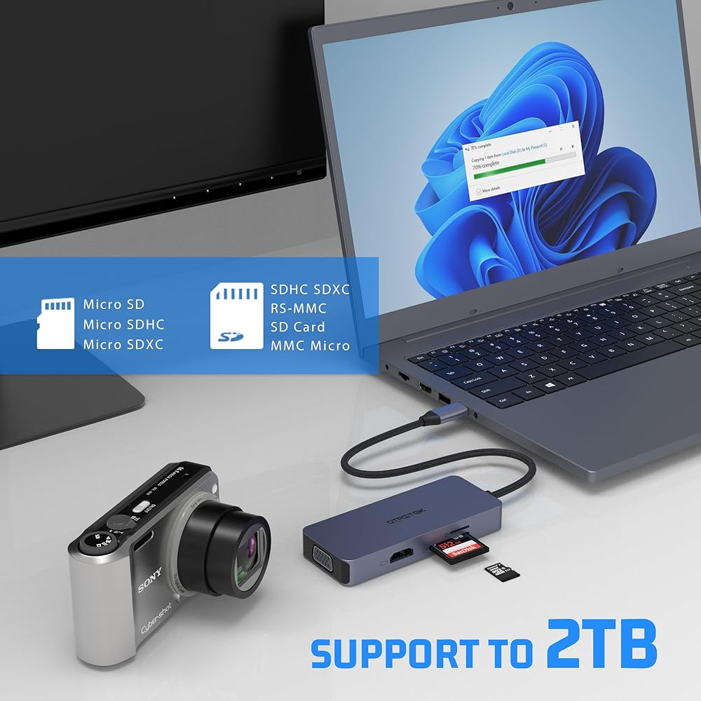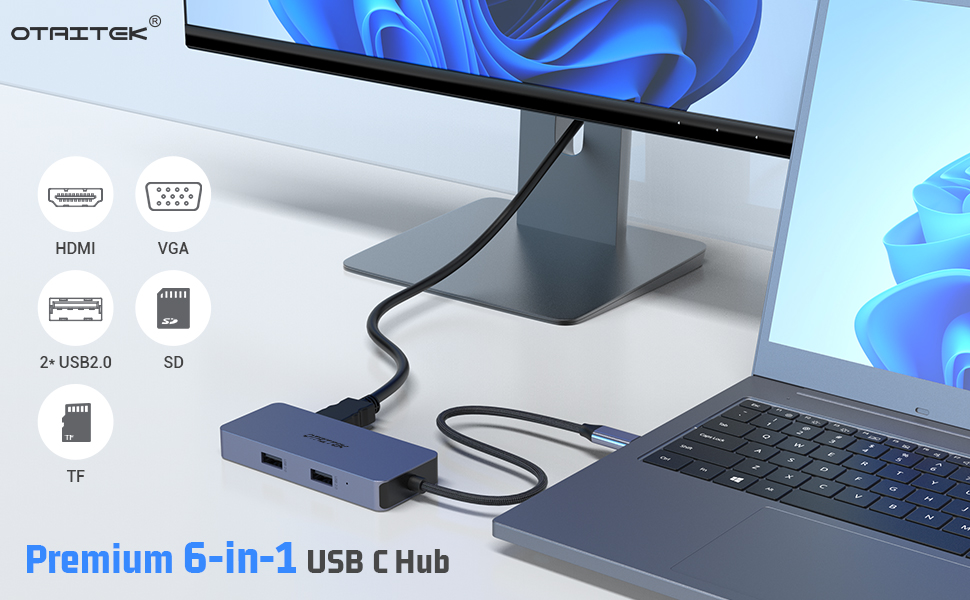 【USB C Hub 6 في 1】: محول محور USB C من OTAITEK مزود بمخرج HDMI 4K، ومخرج VGA، ومنفذين USB، وفتحة قارئ بطاقات Micro SD/TF، والتي تعمل بسهولة على تعدد المهام وتحسين الإنتاجية، مما يوفر لك مساحة عمل أنيقة. صغيرة ولكنها قوية. حل مثالي للأجهزة ذات المنفذ المحدود. التوصيل والتشغيل، لا توجد برامج، لا توجد حاجة إلى برامج تشغيل.