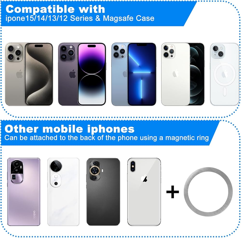 • توافق واسع: متوافق مع هواتف سلسلة iPhone 15 و14 و13 و12 التي تدعم MagSafe، وللهواتف غير المزودة بـ MagSafe، يمكن ربطه بسهولة بالحامل باستخدام الحلقة المغناطيسية المتوفرة.