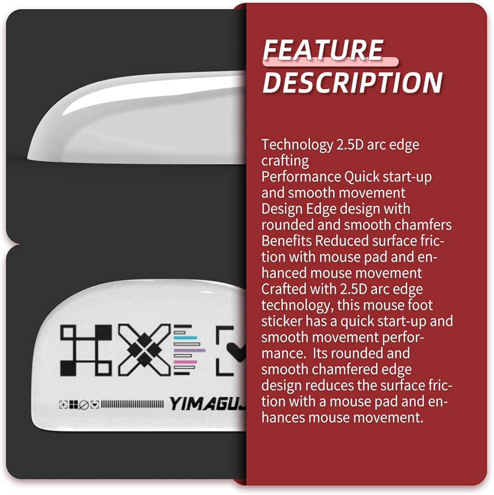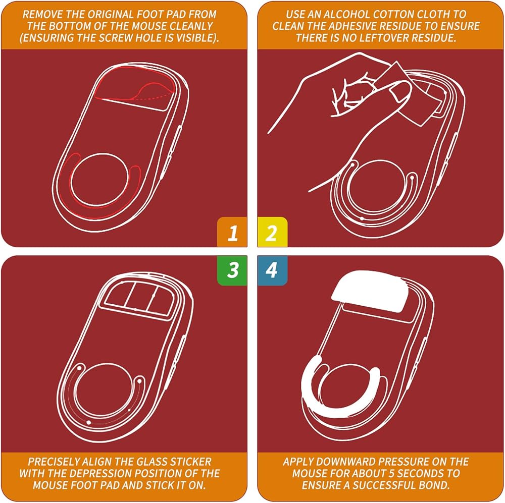 • 【طريقة الاستخدام】لتثبيت الأقدام الزجاجية على الماوس الخاص بك، قم أولاً بتنظيف الجزء السفلي من الماوس لإزالة أي بقايا من الأقدام الأصلية، مع التأكد من أن فتحات المسامير مرئية. بعد ذلك، قم بمحاذاة الأقدام الزجاجية بدقة مع الأخاديد الموجودة على أقدام الماوس ثم قم بتثبيتها بشكل آمن. أخيرًا، اضغط لأسفل على الماوس وقم بالضغط لمدة 5 ثوانٍ تقريبًا للتأكد من اكتمال الالتصاق بشكل صحيح.