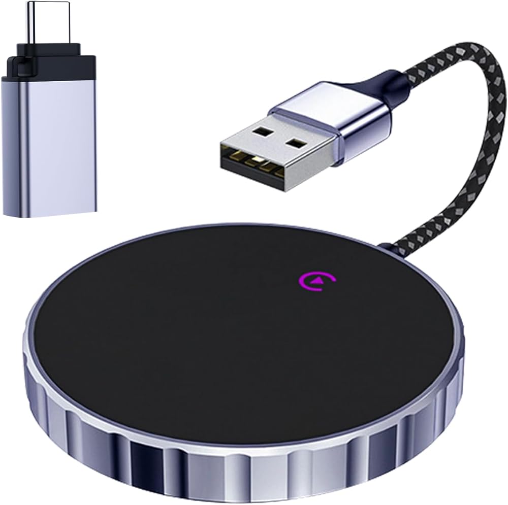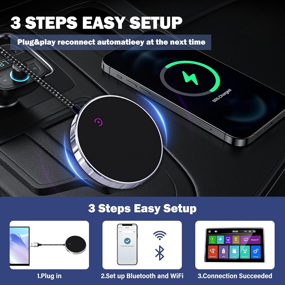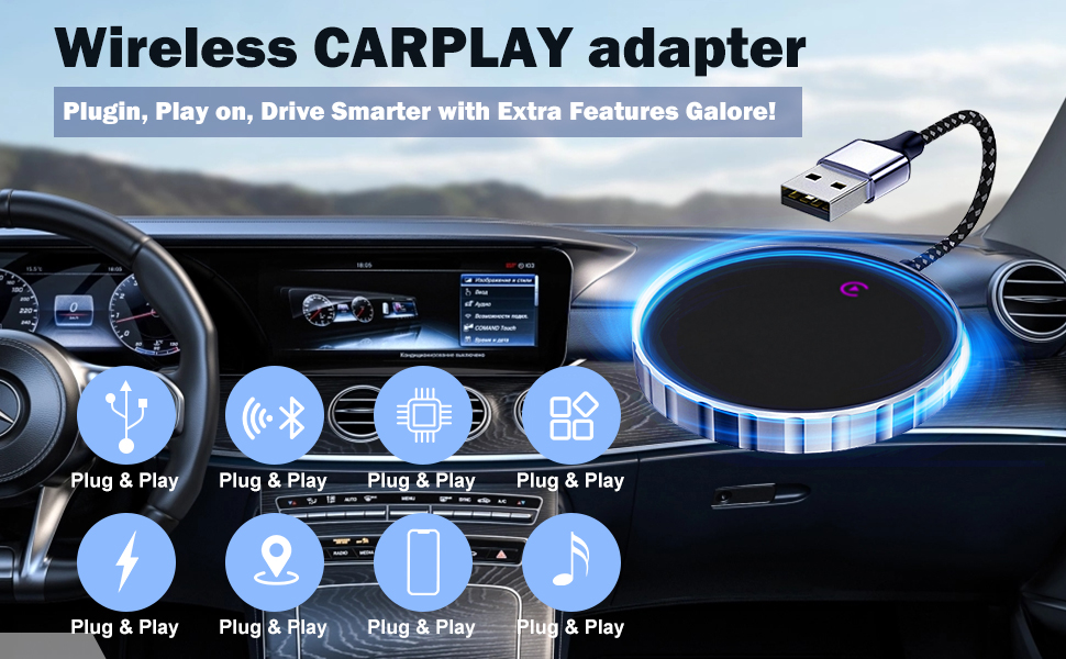 (1) محول CarPlay اللاسلكي: استمتع بجميع ميزات CarPlay مثل التنقل وتشغيل الموسيقى وSiri والمكالمات الهاتفية، دون الحاجة إلى اتصالات سلكية. يمكنك الاستمرار في استخدام وظيفة CarPlay الكاملة والحفاظ على تشغيل السيارة الأصلي، مثل الملاحة وتشغيل الموسيقى ومساعد Siri والمكالمات الهاتفية وما إلى ذلك (متوافق مع Apple CarPlay فقط، وليس لأي نظام آخر).