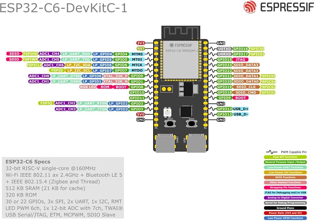 ESP32-C6 embedded, 32-bit RISC-V single-core microprocessor, up to 160 MHz