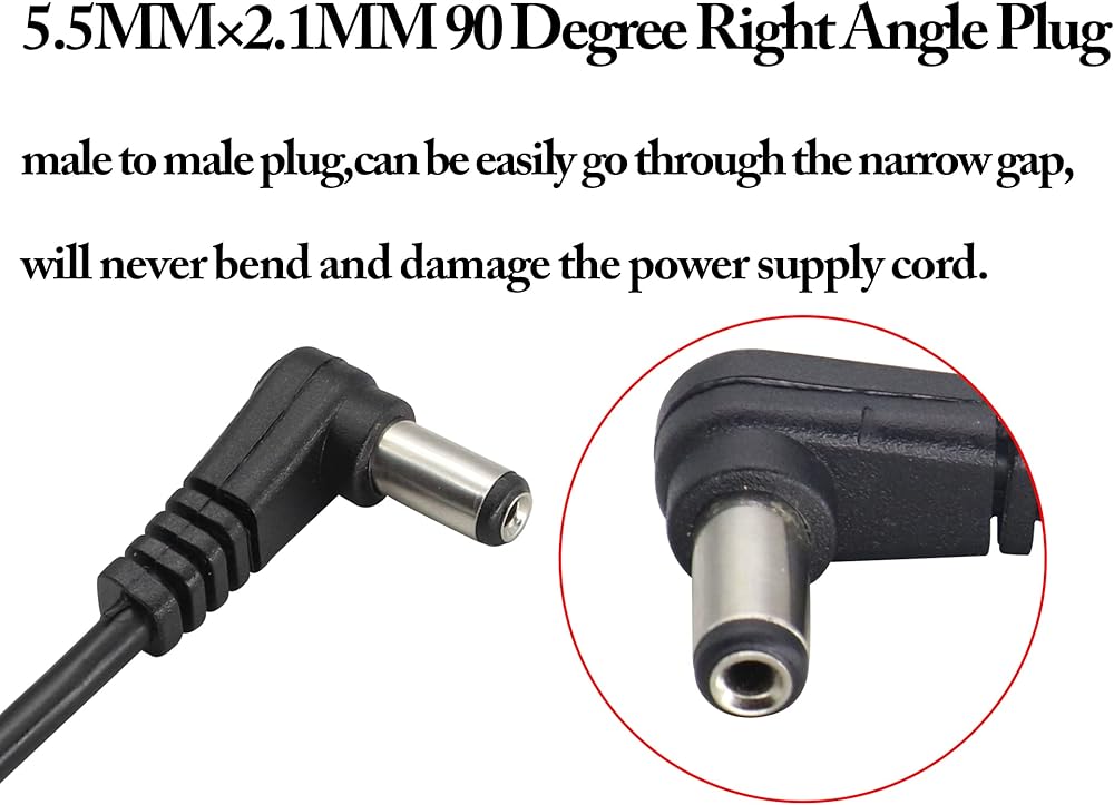 "[Double elbow design]:L-Shape 5.5mm x 2.5mm male to male DC adapter power supply cable, 90 degree right angle male to male 90 degree right angle plug power cord. The 5.5 x 2.5mm 90 degree right angle plug jack power cable can be easily go through the narrow gap, will never bend and damage the power supply cord.