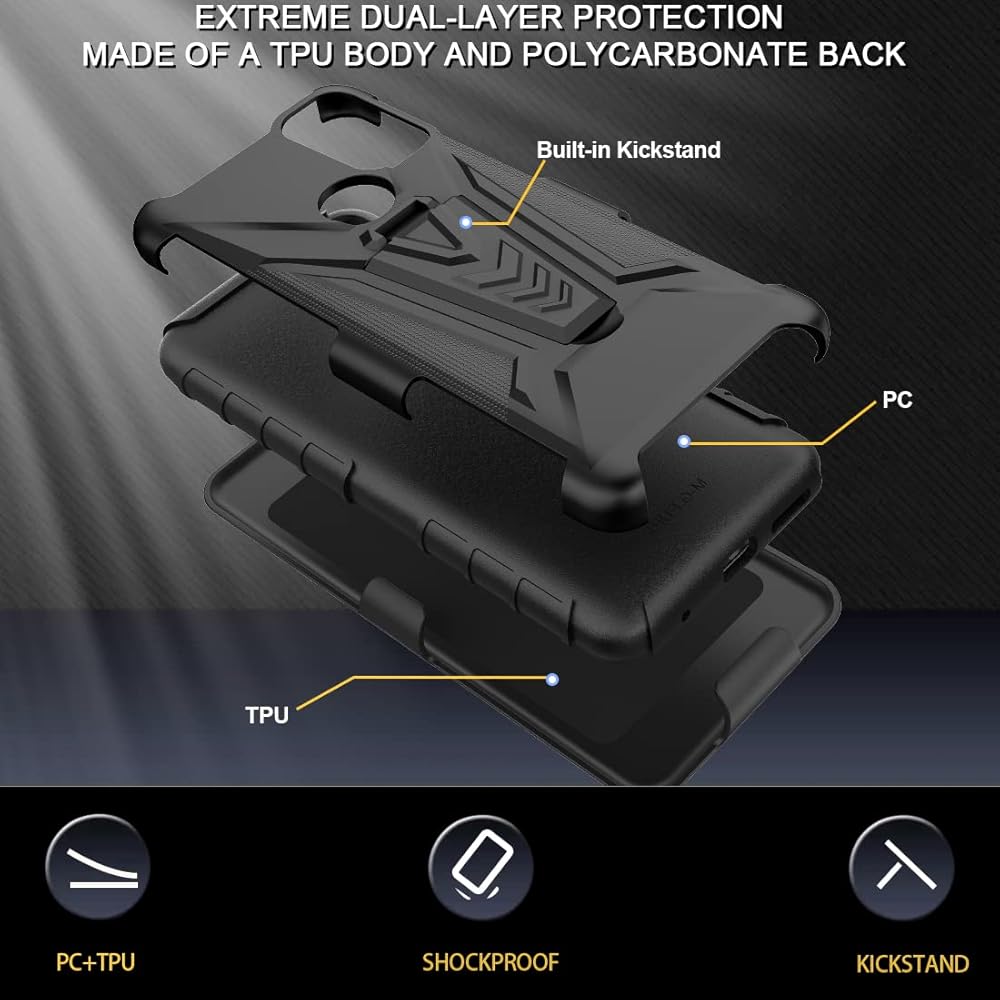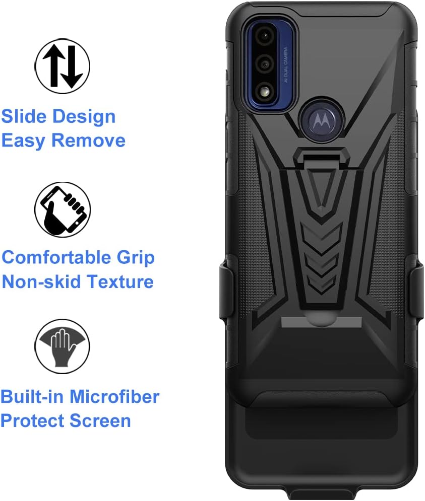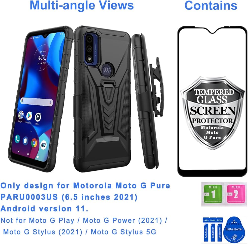 1 x Heavy Duty Armor Belt Clip Holster with Tempered Glass Full Screen Protector for Motorola Moto G Pure PARU0003US (6.5 inch, Released 2021). Android version 11. Not fit Moto G Play / Moto G Power (2021) / Moto G Stylus (2021) / Moto G Stylus 5G. Phone is not included.