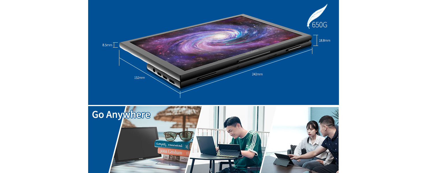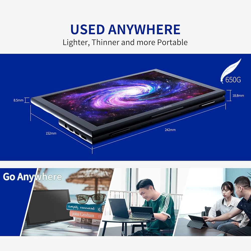 【نحيف وخفيف الوزن】وزن جسم الشاشة بالكامل 650 جرامًا فقط (1.43 رطل)، وهو مناسب جدًا للسفر والعمل واللعب في الخارج وفي أي مكان ترغب في استخدام شاشة خارجية، ضعه في حقيبة الظهر الخاصة بك وانطلق.