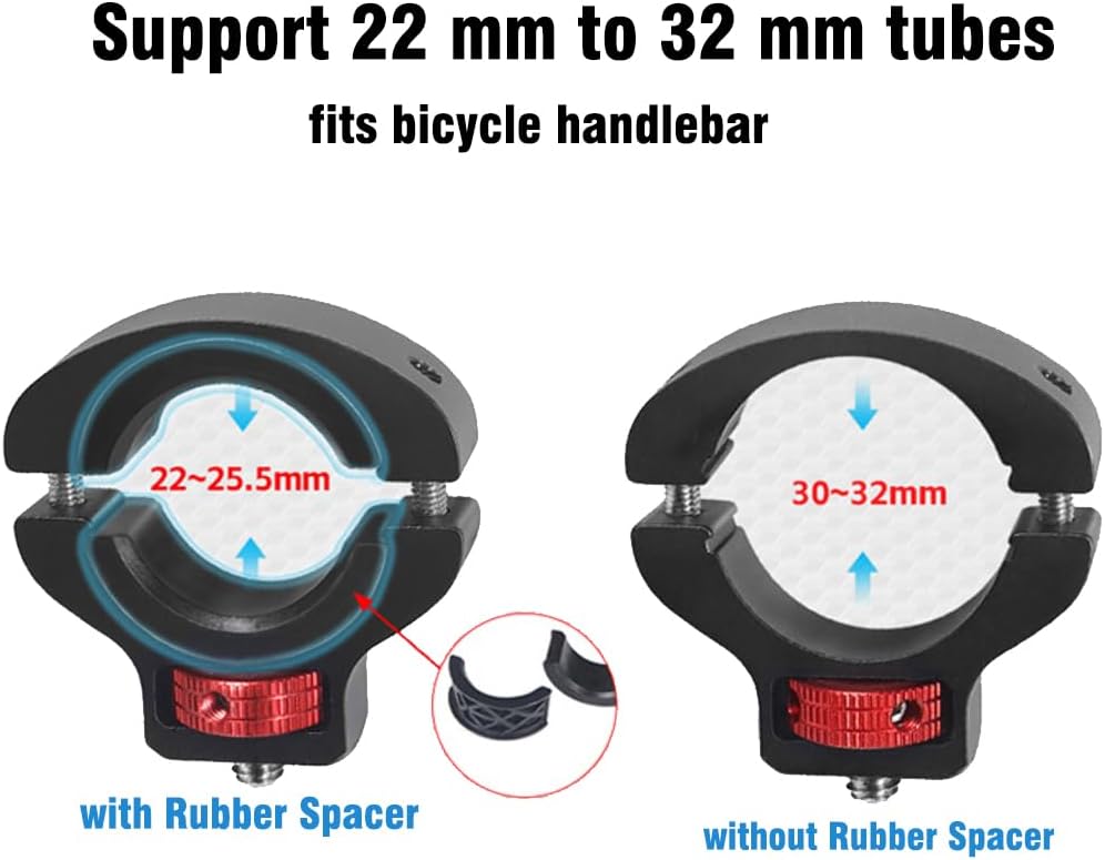 the clamp fits 22mm to 25.5mm diamater tubes with rubber spacer and the clamp fits 30mm to 32mm diameters tubes without rubber spacer.