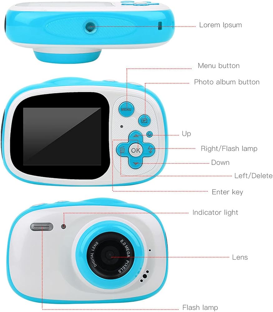 كاميرا للأطفال 8 ميجابكسل، مقاومة للماء 2 بوصة 6X تكبير رقمي 720P@30FPS كاميرا تصوير فيديو رقمية مع وظيفة بلوتوث ومصباح يدوي للأطفال في العطلات/هدايا عيد الميلاد (أزرق)