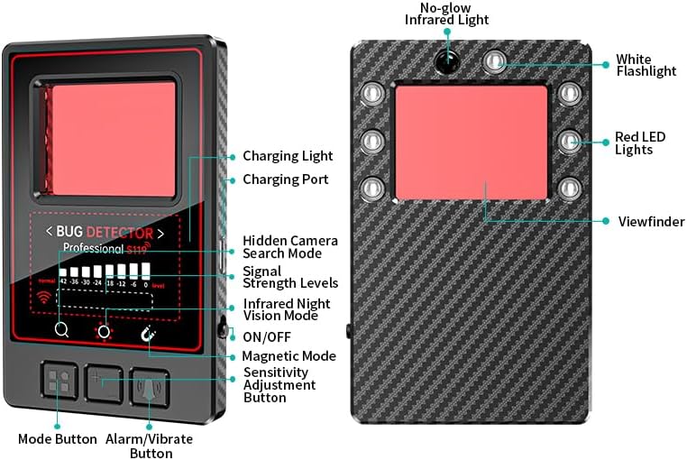 【4*Professional Modes】1. Magnetic Field Detection to find the unwanted widely used magnetized trackers. 2. Camera Lens Finder&Camera Detector to spot the hidden pinhole camera by a simple visual inspection via infrared laser scanning. 3. Signal Detection to detect active bug transmitters like transmitting camera, tracker. 4. Flashlight, no more worries even in dark environment.