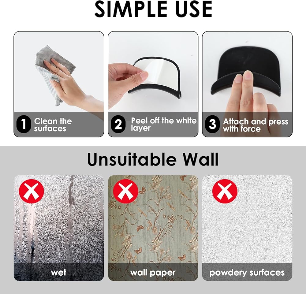 Self Adhesive Design For Easy Installation: This headset stand adopts a self-adhesive design, and the side where the hook is attached has a strong backing adhesive, making it easy to install. The installation method is to clean the wall before pasting, and leave it for 24 hours after pasting to allow the adhesive to cure. After that, the hook can be placed. Note: Not suitable for damp, greasy, or dusty surfaces or walls with wallpaper.