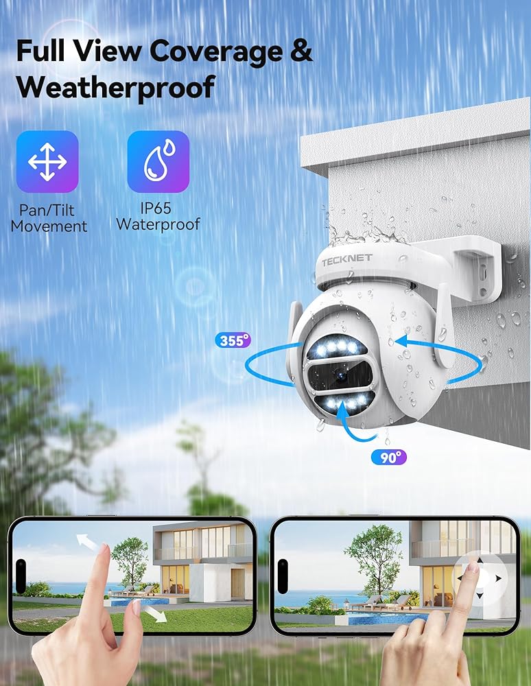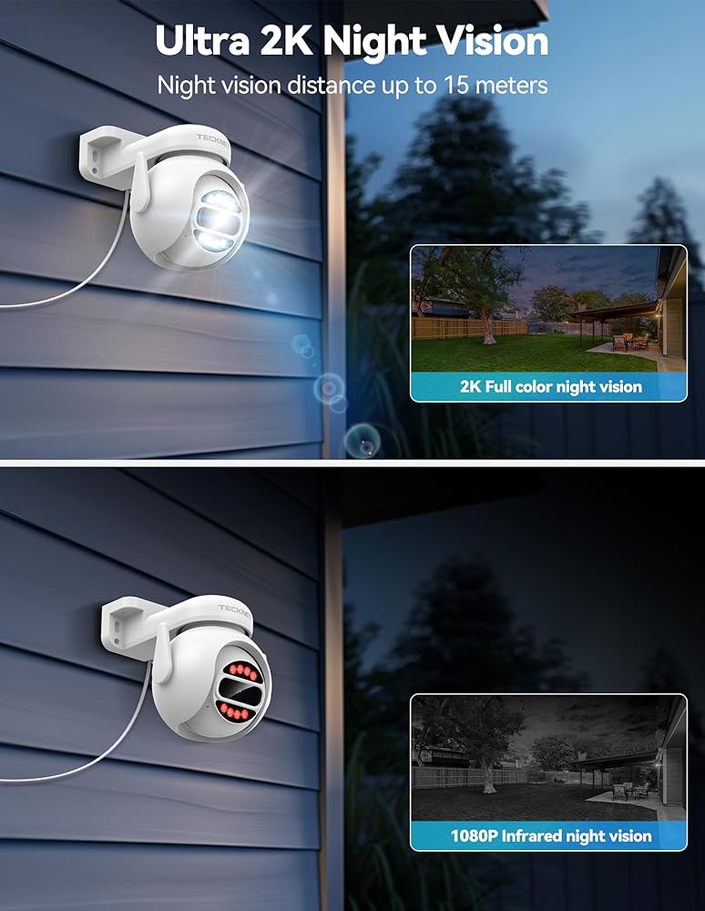 TECKNET 2K Security Camera Outdoor, 360° PTZ WiFi Camera, Color Night Vision Home Security CCTV Camera Systems, Human Detection, 2-Way Audio,Sound-Light Alarm,IP65 Weatherproof
