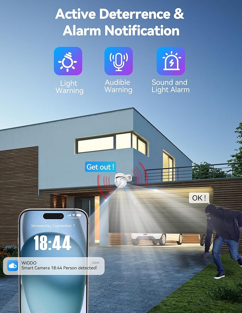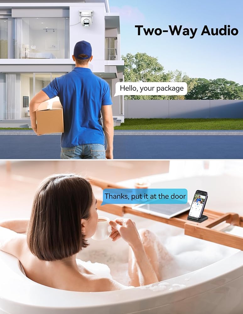【Two-way Audio & Sound and Light Alarm】 The camera's house security has a built-in two-way intercom that allows conversations via a mobile application. You can talk to visitors or family members and use the microphone to ward off suspicious intruders. You can record your own audio as an alarm to extend your usage. The ultra-bright and adjustable light is also supported to frighten unwanted visitors away.