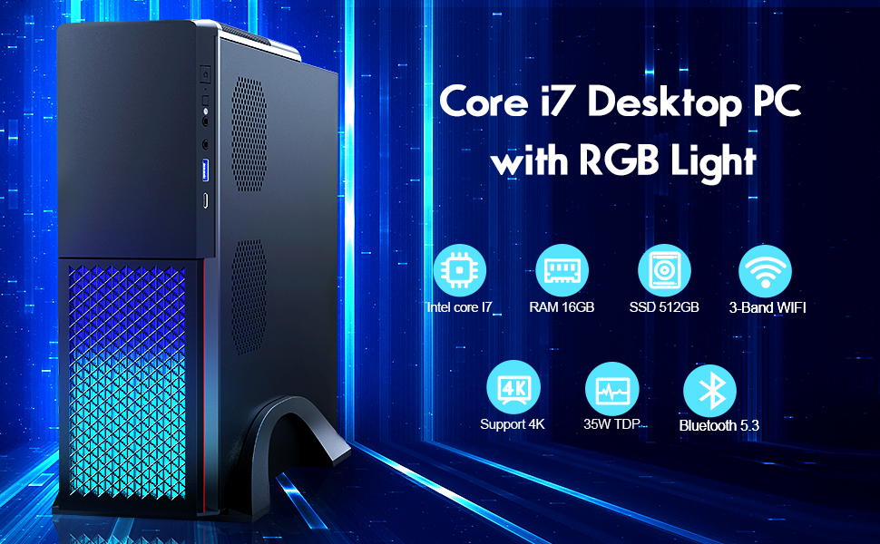 كمبيوتر مكتبي كمبيوتر شخصي 16 جيجا رام 512 جيجا اس اس دي معالج كور i7-4765T مع 2.4 جيجا/5 جيجا/6 جيجا واي فاي 6E بلوتوث 5.3، حجم صغير وإضاءة RGB، لوحة مفاتيح ماوس