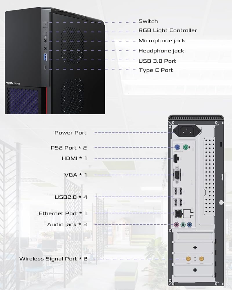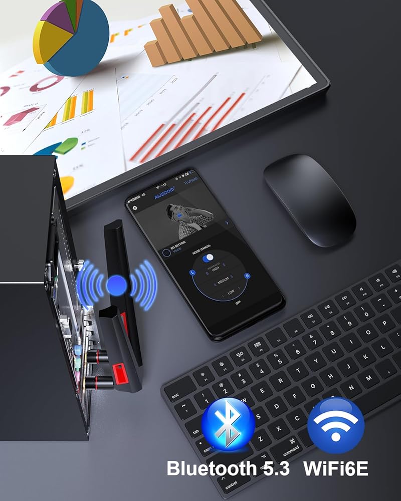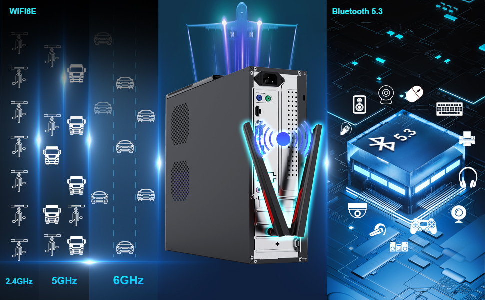 [Bluetooth 5.3 & WIFI6] تم تجهيز أجهزة الكمبيوتر البرجية هذه بتقنية Bluetooth 5.3 مما يعزز إشارة الاتصال ويقلل من زمن وصول البلوتوث. يتمتع WIFI 6E بسرعة قصوى تبلغ 5374 ميجابت في الثانية ومعدل نقل أسرع.