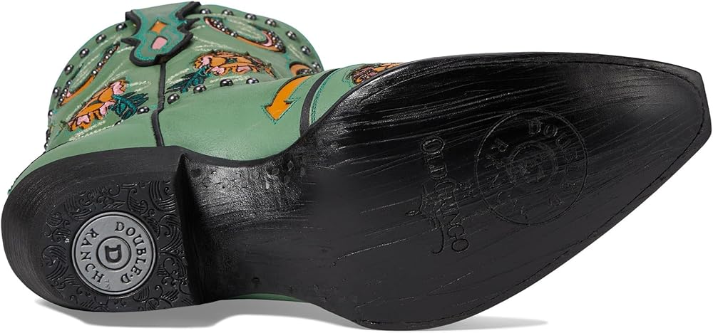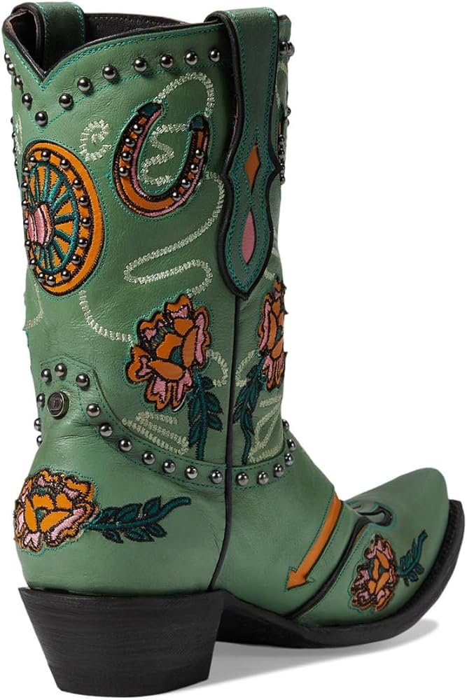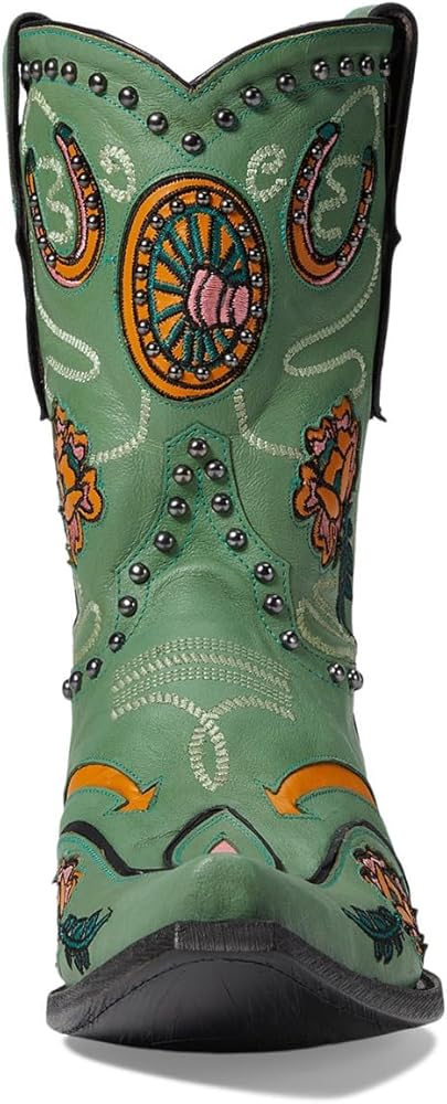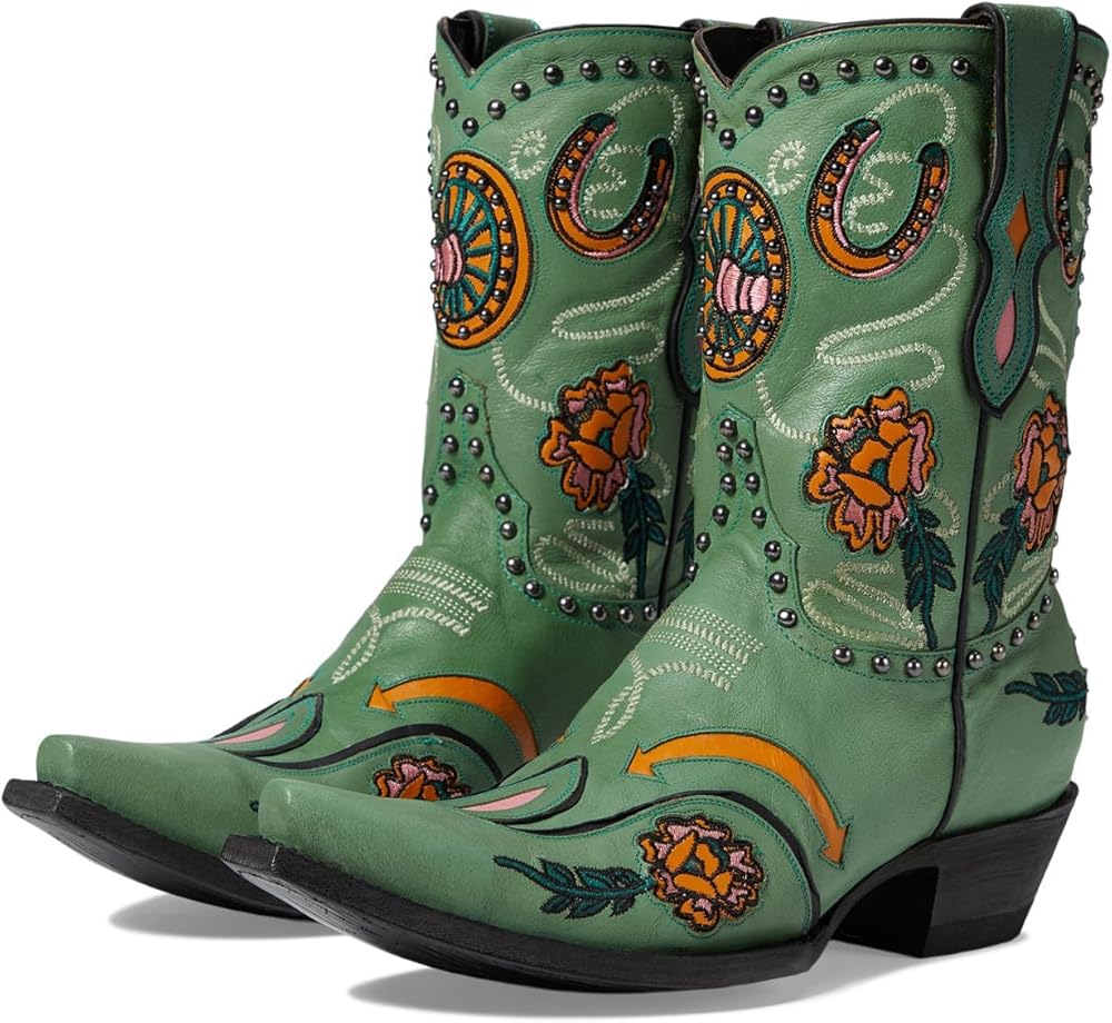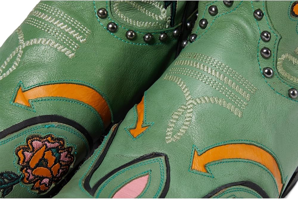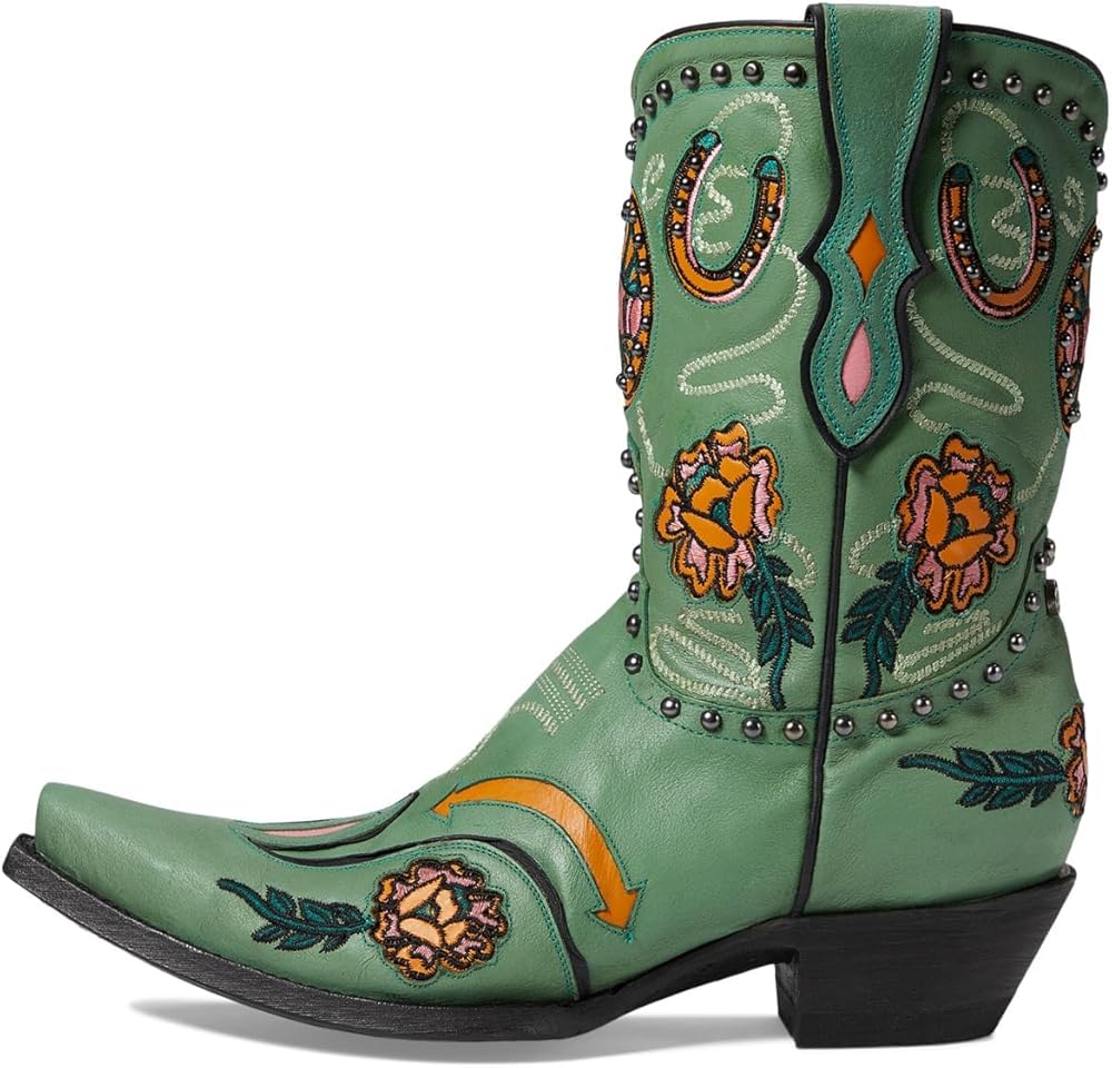 Treat yourself to the perfect blend of style, comfort, and safety by wearing the Old Gringo Wagon Wheel boots. The beautiful turquoise leather upper is accented with fun floral embroidery, wagon wheels, horseshoe patterns, and studded details. They also have a soft leather lining and a padded leather footbed. Leather Working Group Certified. Pull-on style with pull tabs for easy wear. Ankle-length silhouette. Snip toe design. Stacked heels. Leather midsole and outsole. Imported.