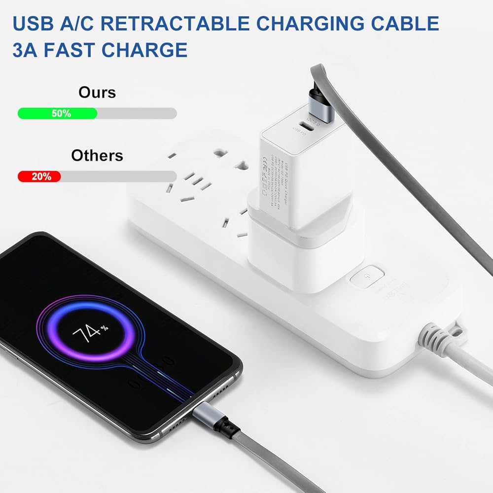 • 【NOTE before purchase】:This is a USB-A to Type-C Retractable cable,please be aware that this is not a USB-C to Type-C cable. Besides, you may need a USB A wall charger to charge your device.TYPE-C-USB Charging cable Adapter supports fast charging, ensuring safe, high-speed charging up to 2 A, and works better for Phone 15 and quick charge TYPE-C Port Devices.