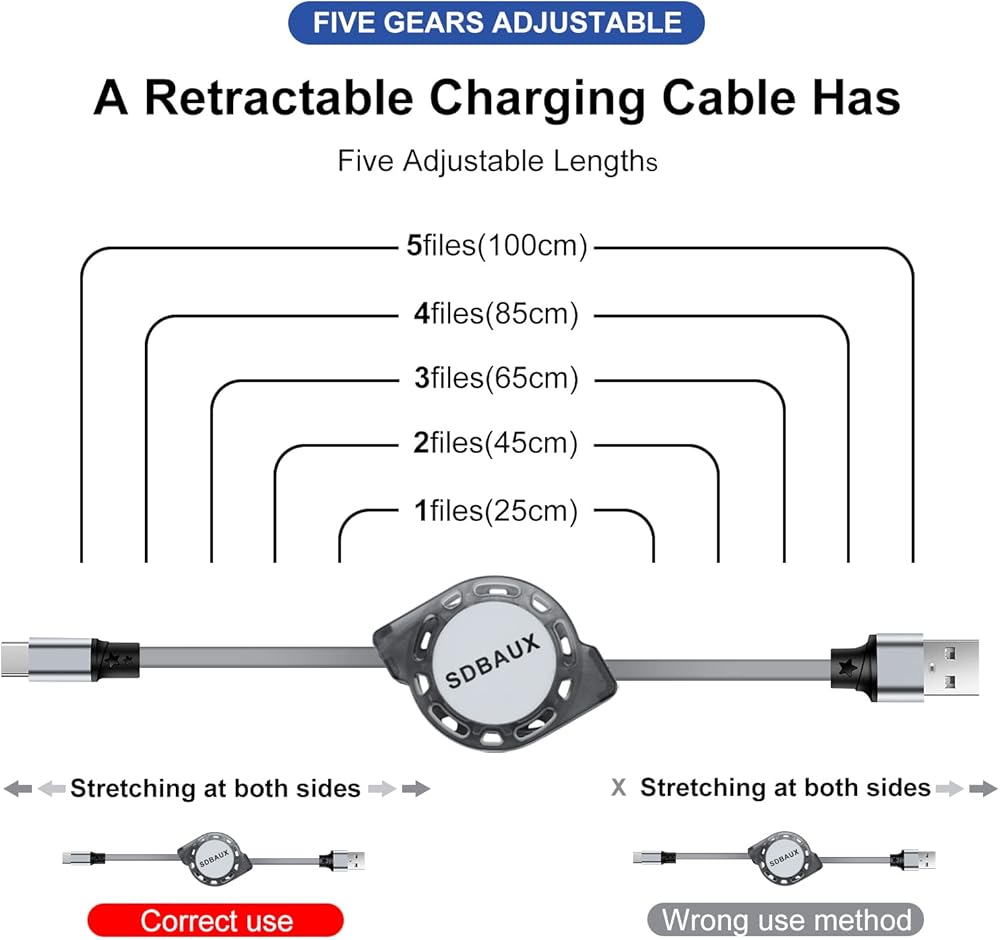 • 【What You Will Get】2 pack 3.3ft USB A to Type-C Retractable Charger cables, 30-day full money back guarantee and 24 x 7 friendly customer service.