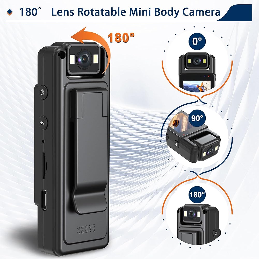 كاميرا الجسم الصغيرة HD1080P يمكن ارتداؤها مع تسجيل الفيديو والصوت، عدسة دوارة 180 درجة، كشف الحركة، أضواء ليلية مساعدة، بطارية 6 ساعات، كاميرا الجسم للرياضة، الأمن الشخصي، شرطة إنفاذ القانون