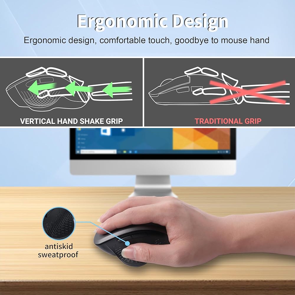 • ☀ ماوس عمودي مريح: يتميز ماوس البلوتوث اللاسلكي بشكل عمودي فريد مع محيط كامل في جميع أنحاء الماوس ومساند راحة اليد الجانبية المريحة للحصول على المقدار المناسب من دعم اليد فقط للعثور على ملاءمة أفضل لمنحنى مناسبك. استخدام ماوس النفق الرسغي هذا يقلل من إجهاد المعصم والساعد، ويوفر قبضة مريحة وطبيعية، ويمنع يد الماوس