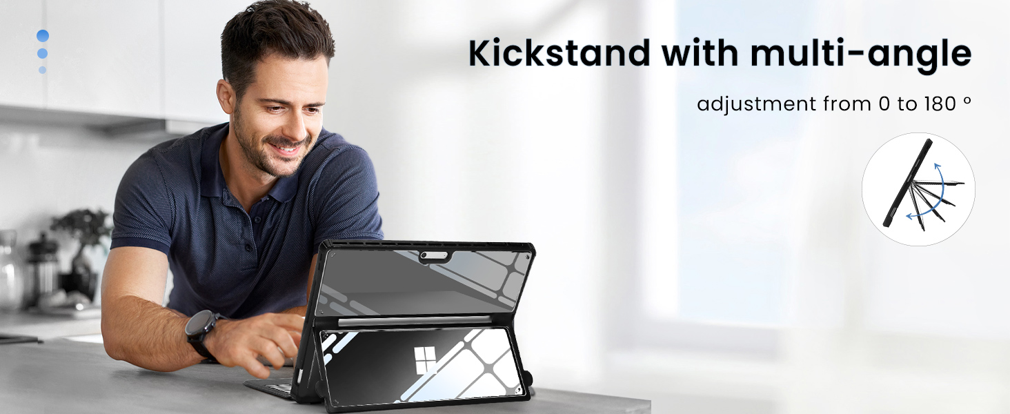 【حامل متعدد الزوايا】يدعم المسند المدمج، مما يسمح لك بالتكيف مع زوايا مختلفة دون إزالة الجراب. كما يوفر الغلاف الصلب المتين الحماية للمسند المدمج ضد الخدوش والتأثيرات والبقع.