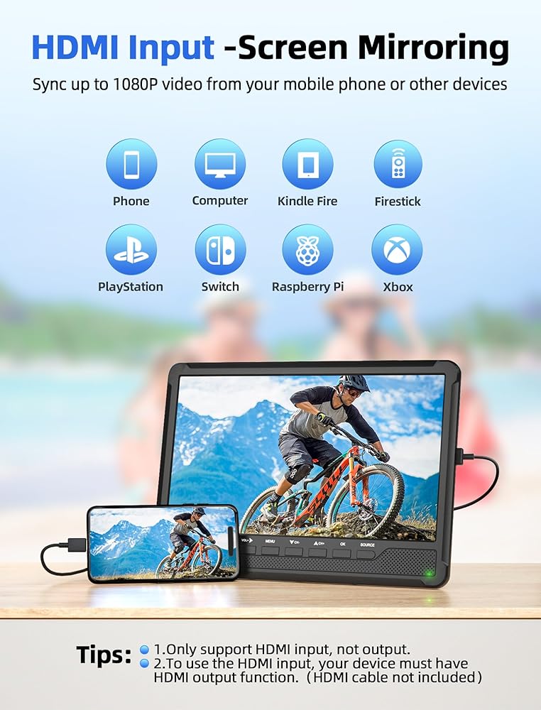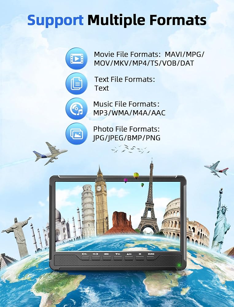 ☀ 【يدعم تنسيقات متعددة 】يتميز تلفزيوننا المحمول الذي يعمل بالبطارية بوظيفة التوصيل والتشغيل الرائعة دون الحاجة إلى تثبيت برنامج التشغيل. يدعم تنسيقات متعددة: ①تنسيقات ملفات الفيلم: MAVI/MPG/MOV/MKV/MP4/TS/VOB/DAT. ②تنسيقات ملفات الموسيقى: MP3/WMA/M4A/AAC. ③تنسيقات ملفات الصور: JPG/JPEG/BMP/PNG ④تنسيقات الملفات النصية: نص.