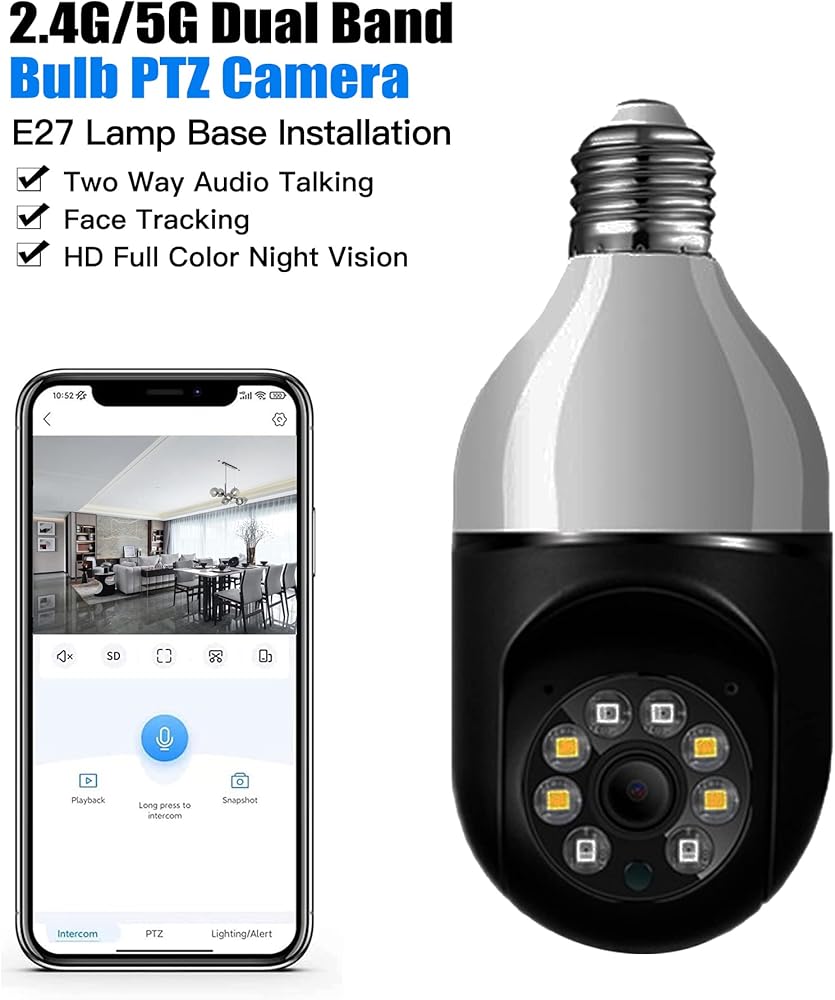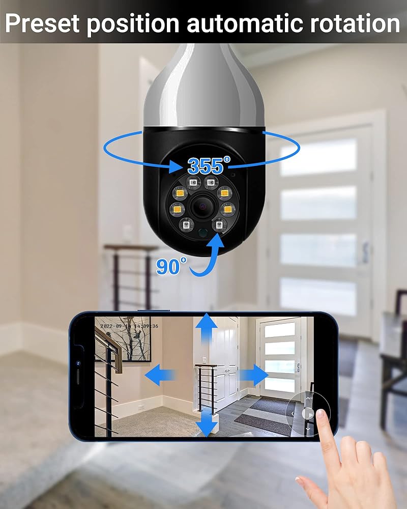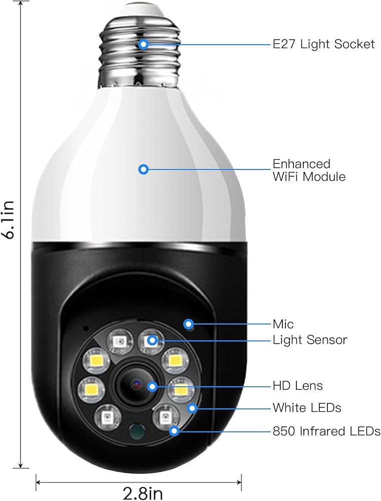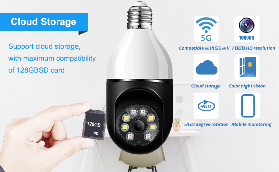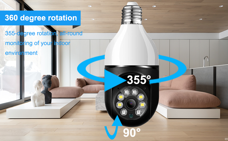 [تركيب لاسلكي وسهل]: كاميرا لمبة الإضاءة هذه، المعروفة أيضًا باسم لمبة إضاءة كاميرا الأمان، متوافقة مع مقابس الإضاءة E26/E27. ما عليك سوى إدخال كاميرا المصباح الكهربائي اللاسلكية وتثبيتها في المقبس، ثم توصيلها بالتطبيق، وستكون جاهزًا. لا حاجة للحفر أو الأسلاك. يدعم كل من واي فاي 2.4 جيجا هرتز و5 جيجا هرتز.