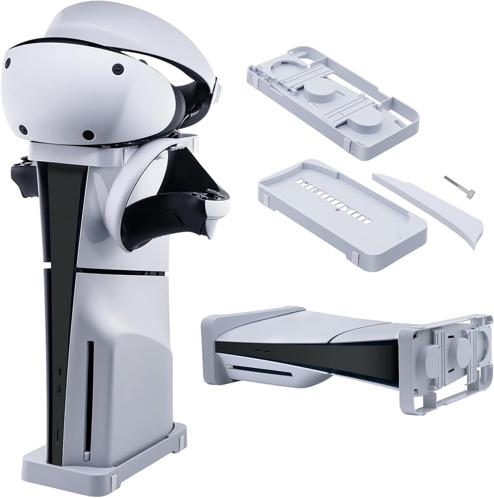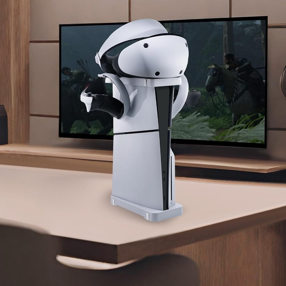 Multi-functional Holder:The stand includes a specially designed holder that is compatible with the PS VR2 and two controllers, or 2 gaming headphone. This feature provides neat storage solutions and helps in organizing your gaming accessories, saving valuable space in your gaming area.