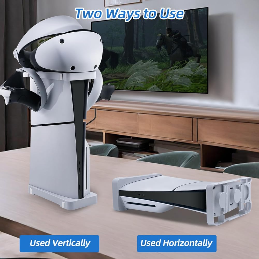 Space Saving and Organizational Benefits:Not only does this stand provide a secure home for your PS5 Slim, but it also contributes to a cleaner, more organized gaming setup. Its design allows for neat storage, helping to maximize space and keep your gaming area clutter-free.