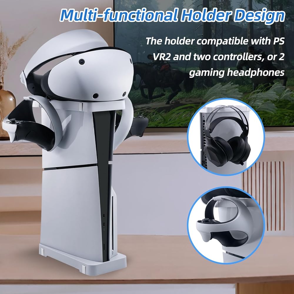 Multi-functional Holder: The stand includes a specially designed holder that is compatible with the PS VR2 and two controllers, or 2 gaming headphone. This feature provides neat storage solutions and helps in organizing your gaming accessories, saving valuable space in your gaming area.