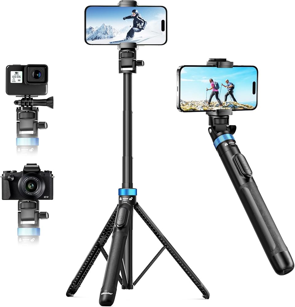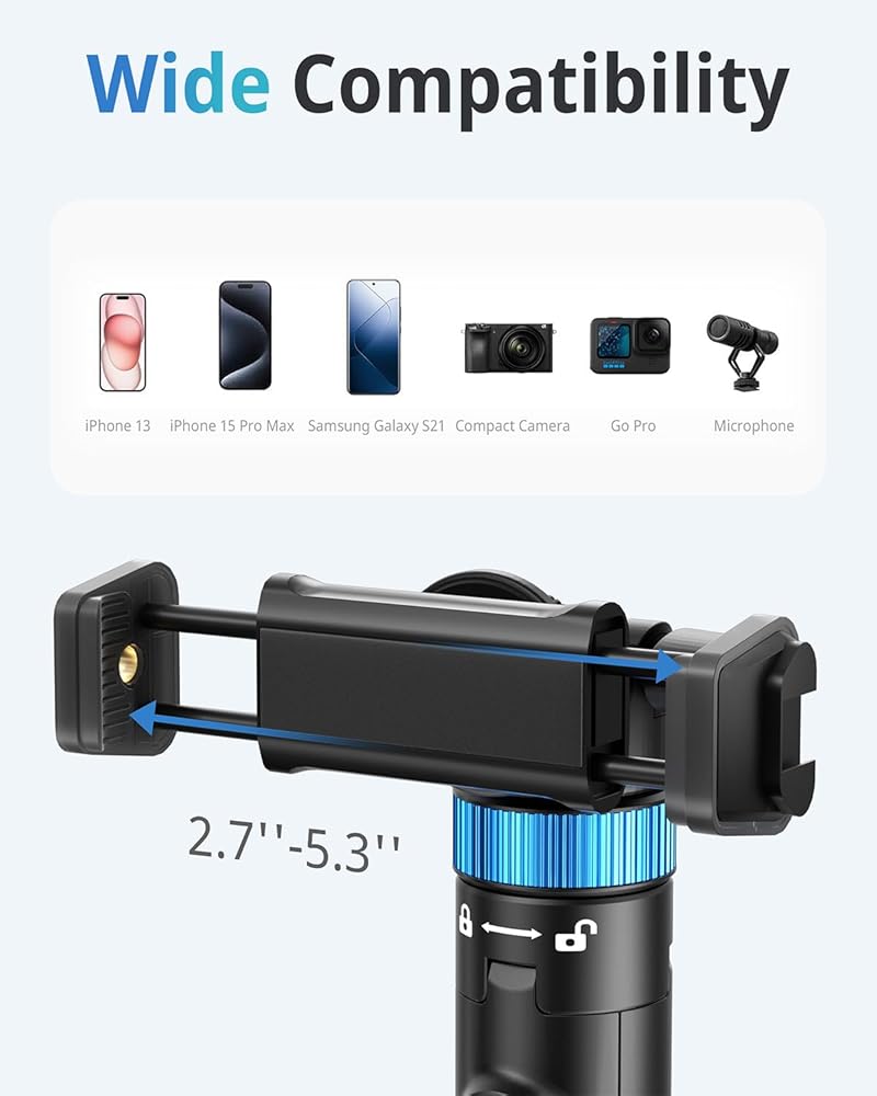 توافق واسع: تم تصميم حامل عصا السيلفي الثلاثي الخاص بنا لكل من الهواتف الذكية وكاميرات الحركة، مما يجعله الرفيق المثالي لالتقاط لحظاتك التي لا تنسى. متوافق بسلاسة مع مجموعة متنوعة من الأجهزة، فهو يوسع إمكانياتك الإبداعية.