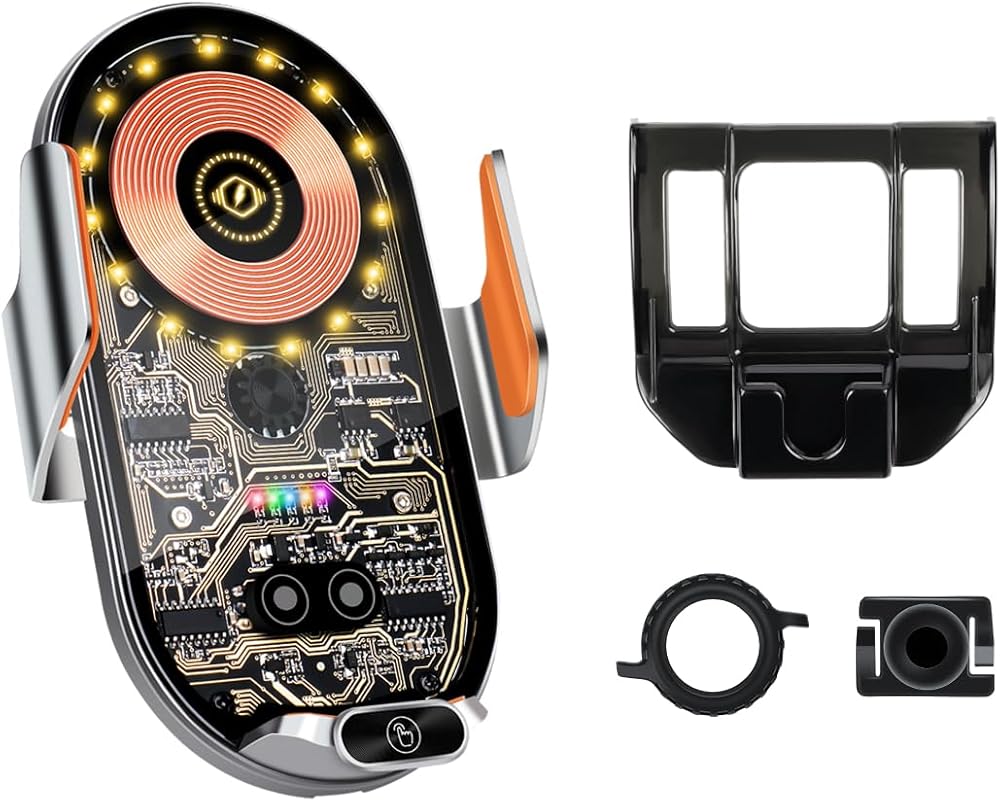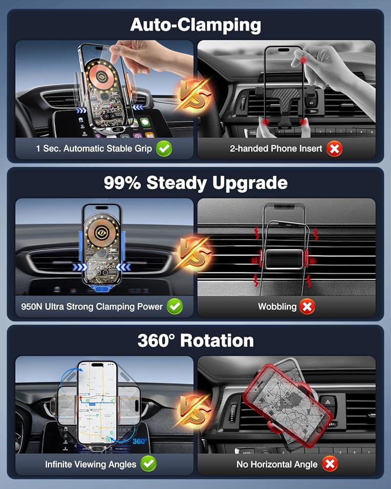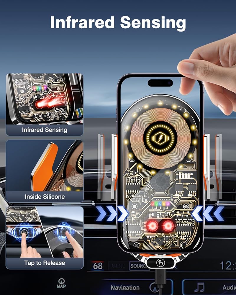 Auto Clamping & One-Button Release: The wireless charger phone holder is equipped with an infrared sensing system. Just tap the bottom or the top of the back, the grip arms open up and as soon as it senses the phone it closes. Making easy one-handed operation. The car phone mount holds your phone perfectly even on really rough roads or sudden stops.