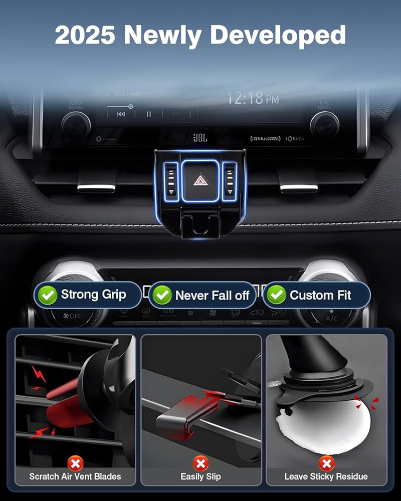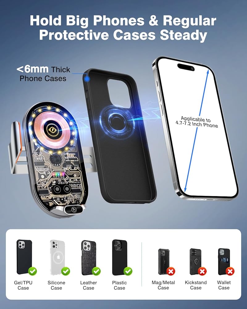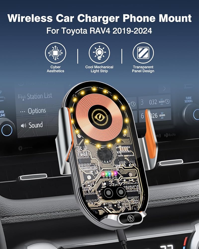 Phone Holder for Toyota RAV4: The car phone holder is perfectly compatible for Toyota RAV4 Limited, Adventure, XLE Premium, RAV4 Hybrid and Prime XSE 2019-2024 with vent control. (Not or RAV4 LE XLE SE without vent control.) Applicable to 4.7-7.2 inch phone and no need to remove the phone case. The wireless charger can charge through 6 mm thick phone cases, but before charging, please take out any metal or magnetic objects, credit cards, or shrapnel holders.
