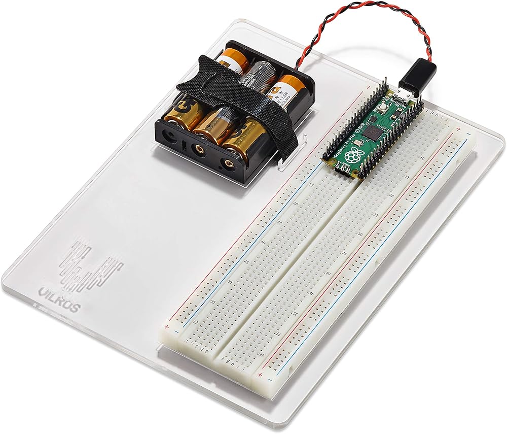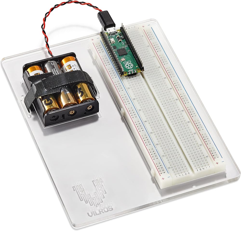 Acrylic board holds a breadboard and a 3 aa Battery Holder for an easy neat setup for your Pico Projects.
