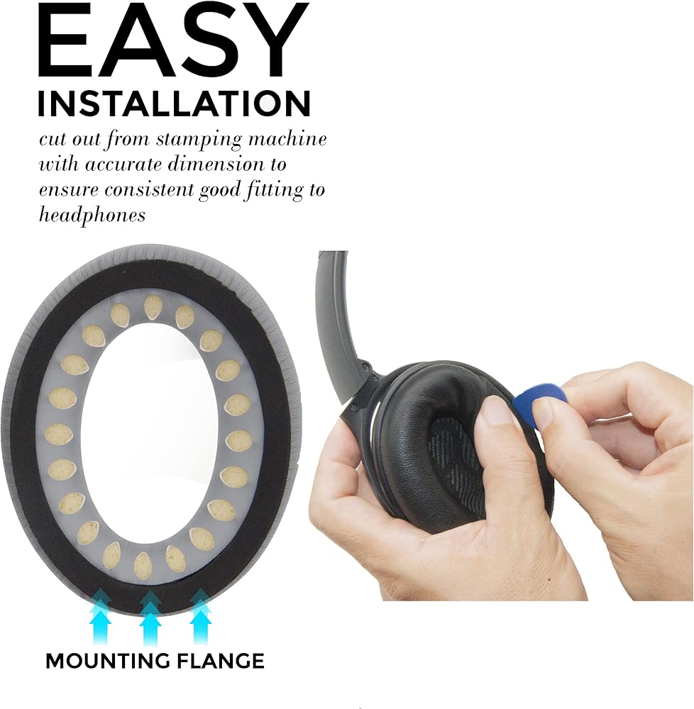 سهولة التركيب: يتم قطع كل شفة تثبيت لوسادة الأذن بدقة بواسطة آلة ختم، مما يضمن أبعادًا متسقة ودقيقة لتناسب سماعات الرأس بشكل مثالي. يتم تضمين أداة صغيرة في الحزمة للمساعدة في عملية التثبيت.