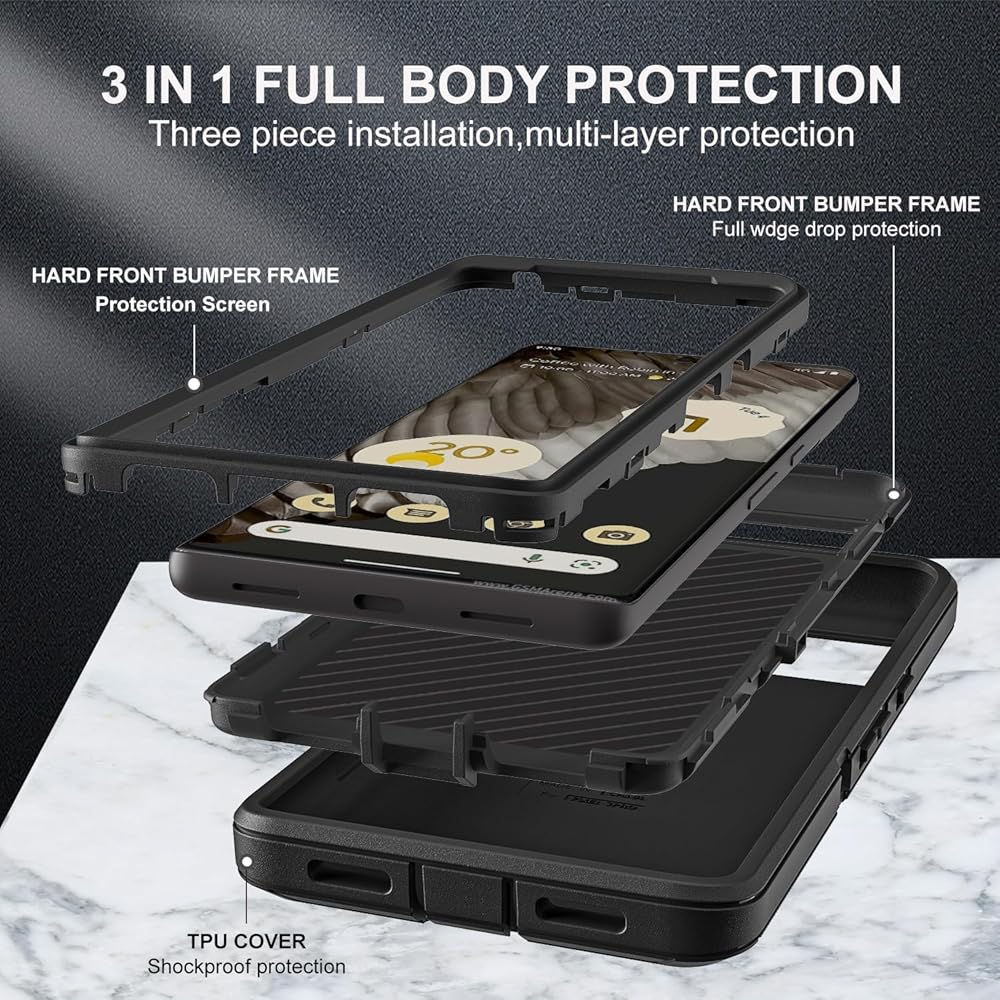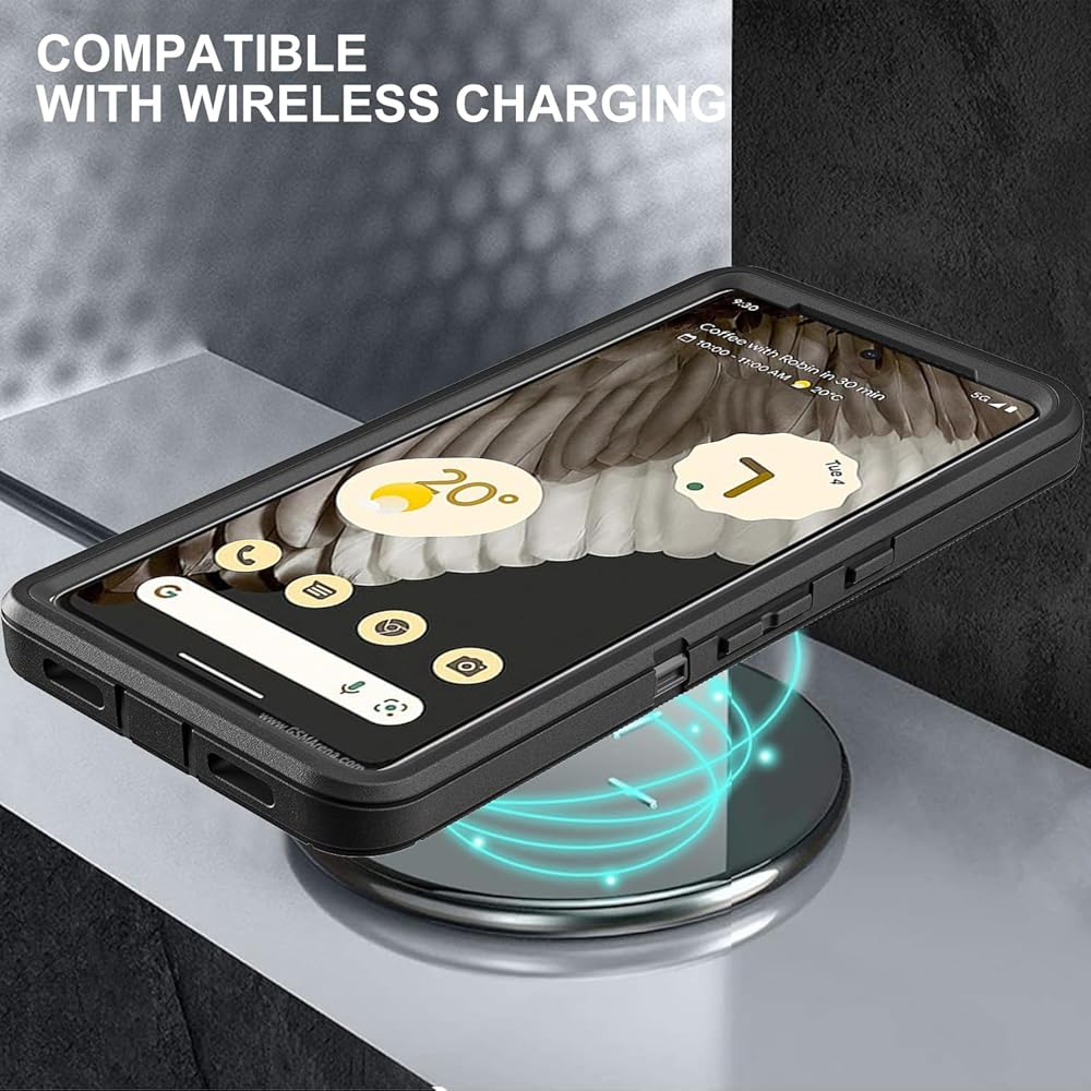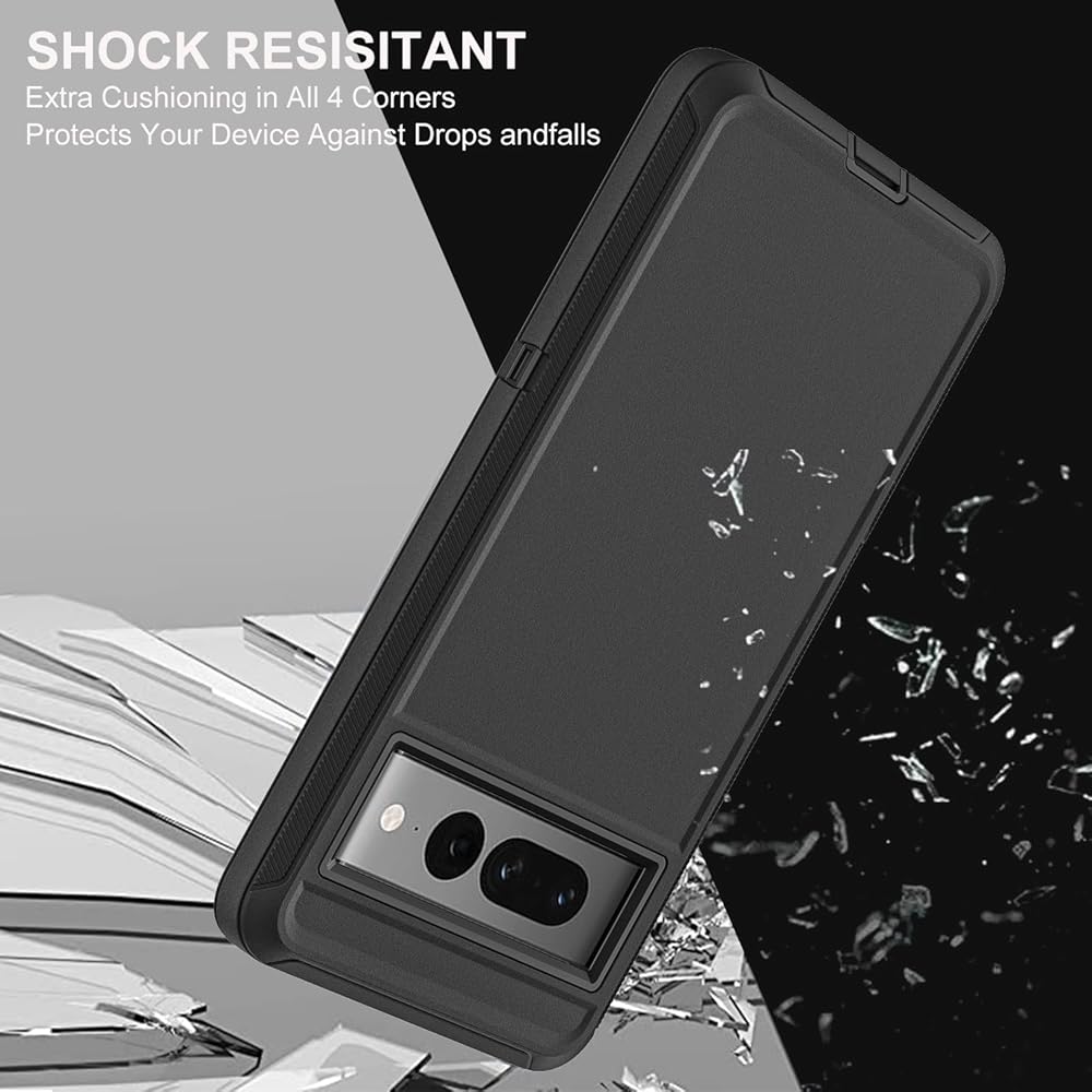 حافظة لهاتف Google Pixel 7 Pro، حافظة متينة مقاومة للصدمات/السقوط/الغبار من الدرجة العسكرية مع قطعتين واقي شاشة مرن من مادة TPU وواقي عدسة الكاميرا (أسود/أسود)