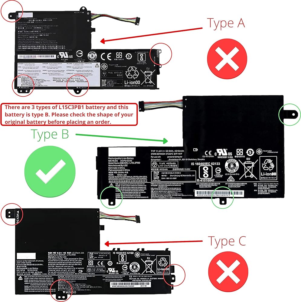 ملاحظات: هذه البطارية متوافقة فقط مع إصدار 11.25 فولت و11.4 فولت. هناك 3 أنواع من بطاريات L15C3PB1 وهذه البطارية من النوع B. يرجى التحقق من شكل البطارية الأصلية قبل الطلب.
