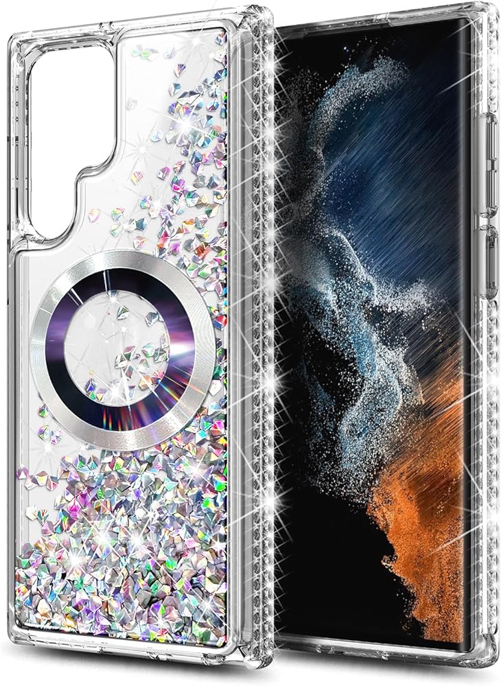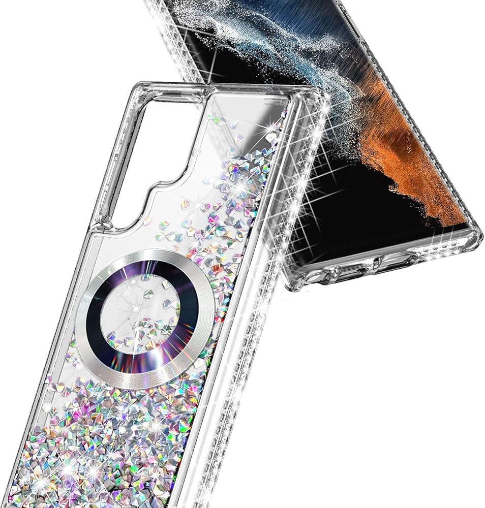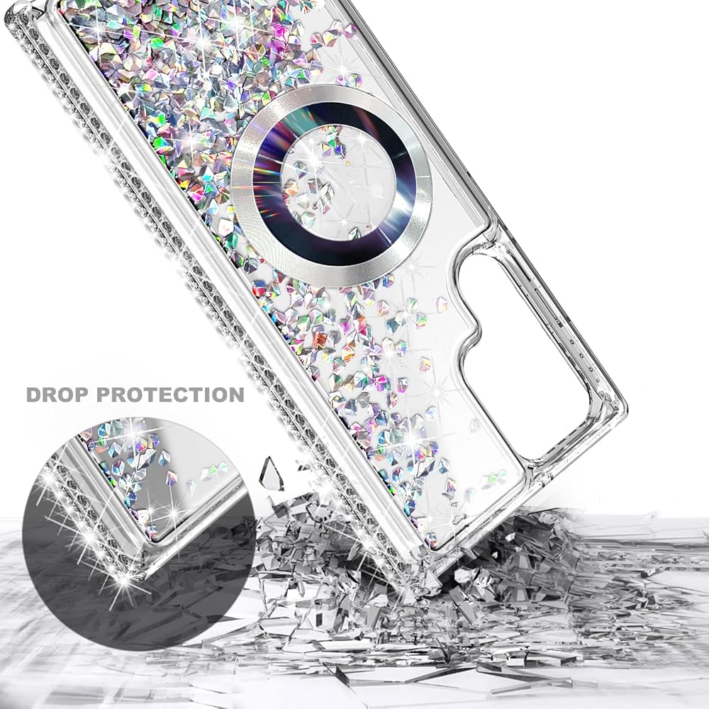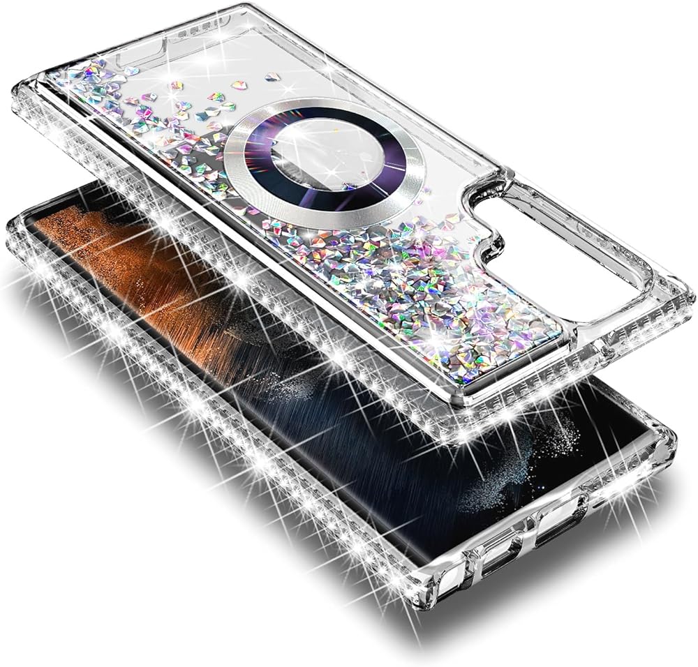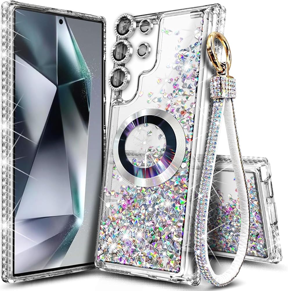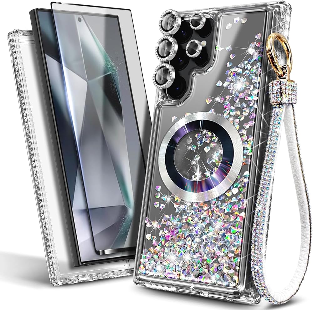 حافظة NGB Supremacy مصممة لهاتف Samsung Galaxy S24 Ultra مغناطيسية لـ MagSafe، واقي شاشة من الزجاج المقسى / واقي عدسة الكاميرا / حبل حزام المعصم، حافظة لطيفة سائلة لامعة (ألماس)
