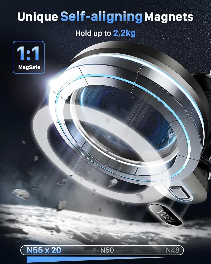 • Unique Self-aligning Magnets, 1:1 Mag-Safe: YOSH introduces the 2024 Mag-Safe Car Mount with self-aligning magnets and a 1:1 Mag-Safe design for a secure 0.1s attachment. It supports up to 2.2kg, ensuring a firm hold