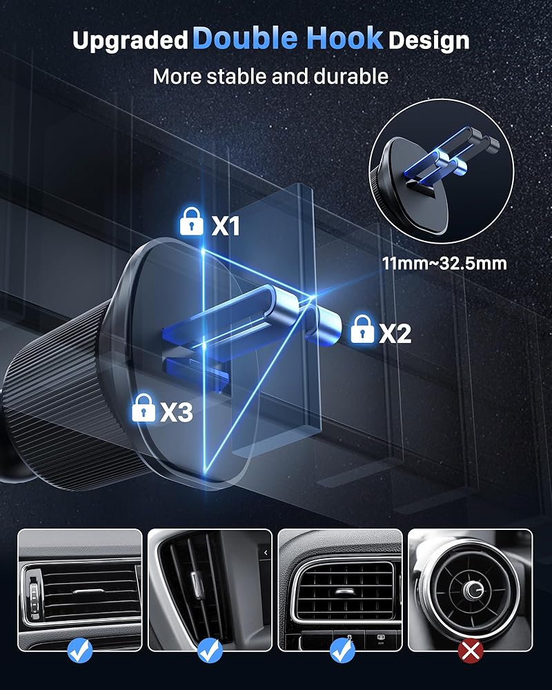 • Upgraded Double Metal Hooks, but not for Circular Vents: YOSH double metal hooks enhances stability and prevents the mount from falling off. Fits vents depths of 11 to 32 mm. Suitable for horizontal and vertical vents only, not round vents (Mercedes/Audi)