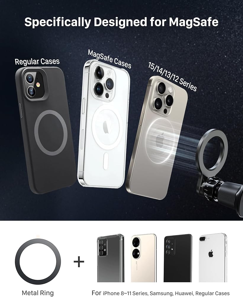 • 100% Wide Adaptability: The Mag-Safe car mount fits iPhone 12-15 series, Mag-Safe cases, and non-magnetic phones with the included metal ring. It also works with Samsung Google Pixel Huawei etc. Use the metal ring for other models or non-Mag-Safe cases (Not interfere with wireless charging)