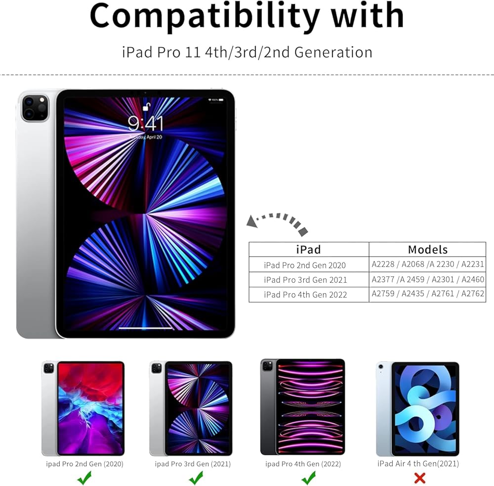【نموذج التوافق】مصمم لجهاز iPad 11 pro الجيل 4th/3rd/2nd/1st Gen 2022/2021/2020/2018 (الموديل: A2759/A2435/A2761/A2762/A2377/A2459/A2301/A2460/A2228/A2068/A2230/ A2231/A1980/A2013/A1934/A1979). غير متوافق مع أي موديلات iPad أخرى. يرجى التحقق من الجزء الخلفي لجهاز iPad الخاص بك للعثور على رقم الطراز قبل تقديم الطلب.