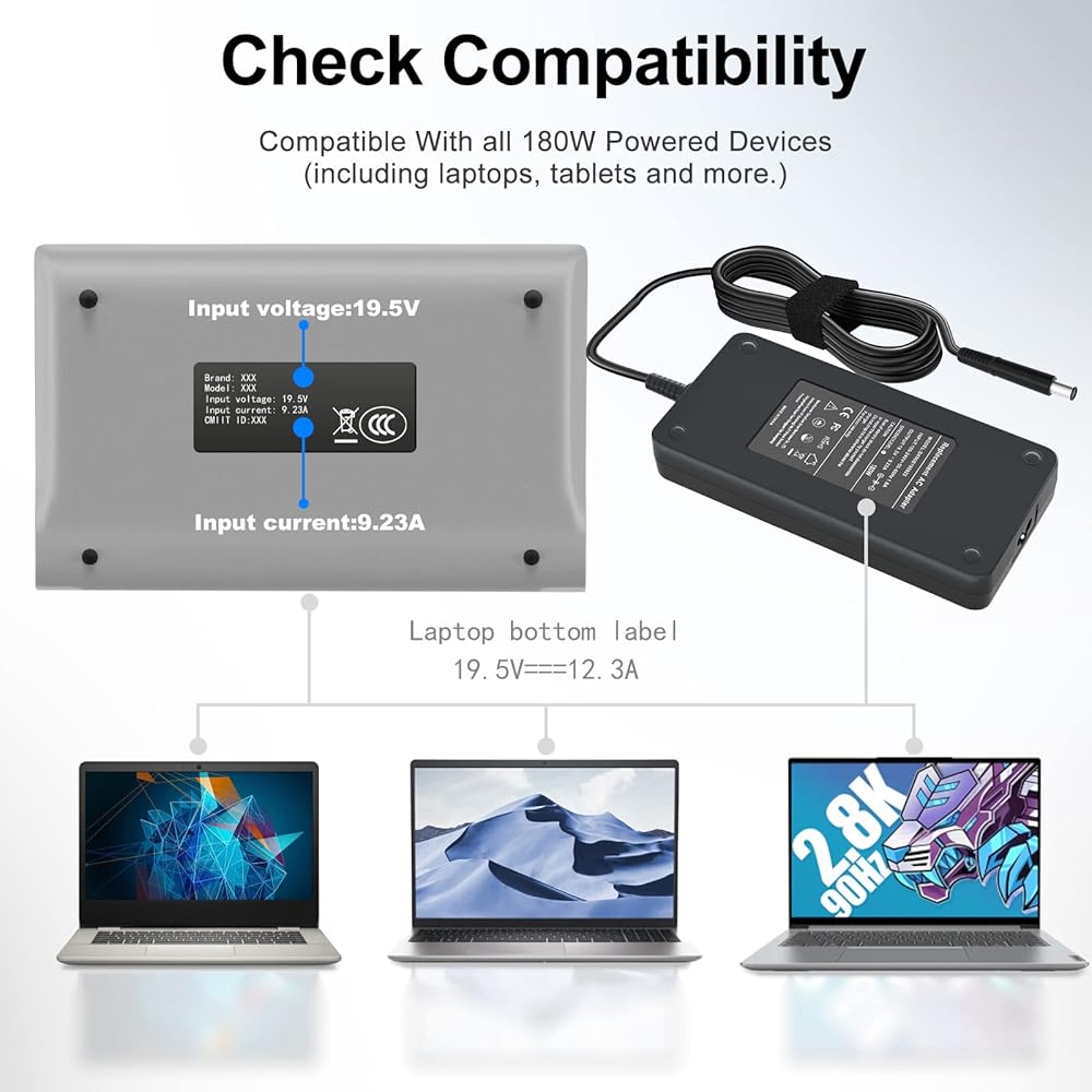 • Compatible with P/N: NDFTY, 450-AGCU, 0N7MWW, N7MWW, WW4XY, 0WW4XY, DA180PM111, FA180PM111, ADP-180MBB, DW5G3, 0DW5G3, 74X5J, 074X5J, WW4XYM, TW1P0, F0G4K, JVF3V, 331-1469, 331-7957, (PN can be found in the label of your original charger)