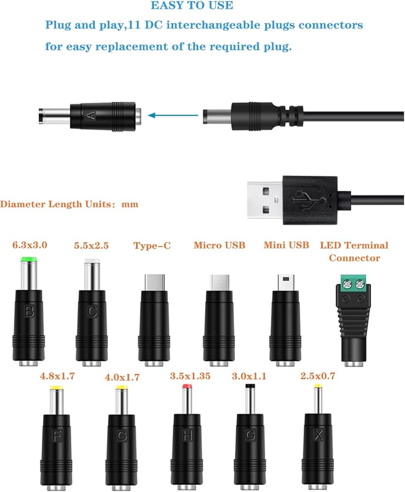 سلك طاقة USB إلى تيار مستمر 5 فولت، كابل شحن جاك قابس تيار مستمر 5.5 × 2.1 مم مع 11 طرف موصل قابل للتبديل (7 أطراف تيار مستمر، 3 أطراف USB، 1 موصل طرفي LED) بطول 5 أقدام