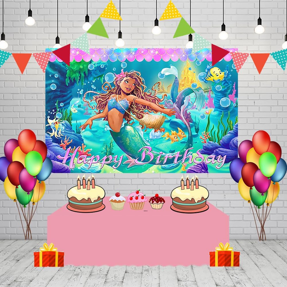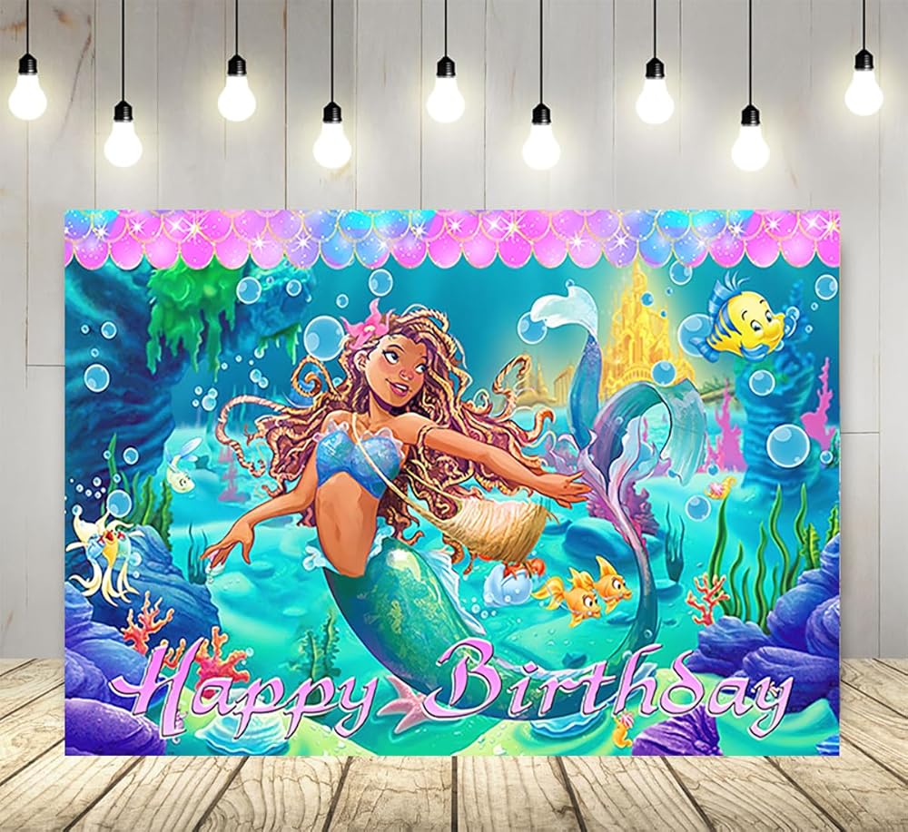 حورية البحر الصغيرة 2023 خلفية لمستلزمات حفلات أعياد الميلاد مقاس 5 × 3 أقدام كارتون أسود آرييل موضوع لافتة استحمام للأطفال لتزيين طاولة الكيك وحفلات أعياد الميلاد