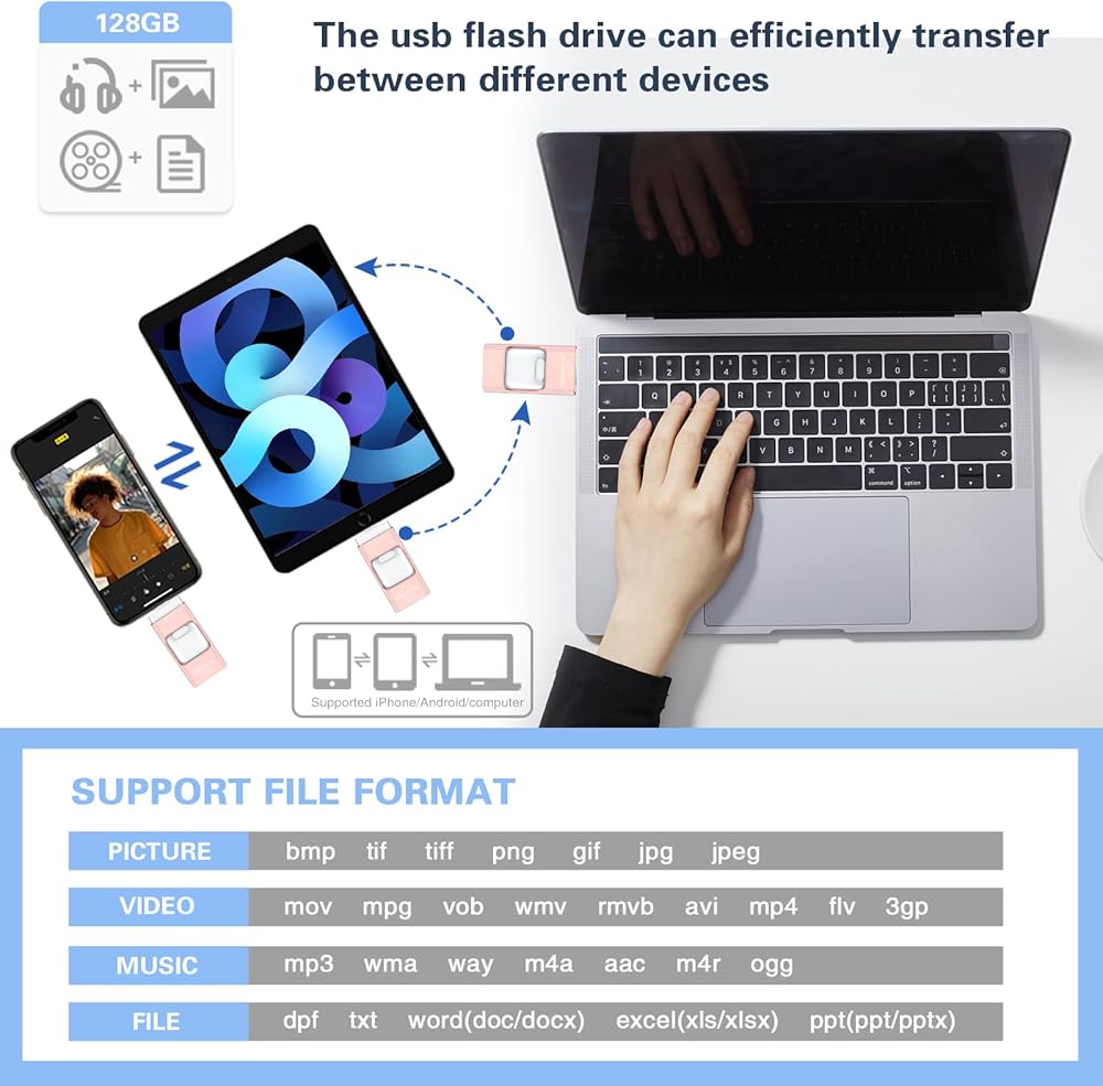 محرك أقراص ثابتة خارجي سعة 128 جيجابايت لأجهزة iPhone/iPad/Android/PC/الكمبيوتر المحمول، محرك فلاش للهاتف، يحتاج إلى تطبيق (وردي، O3)