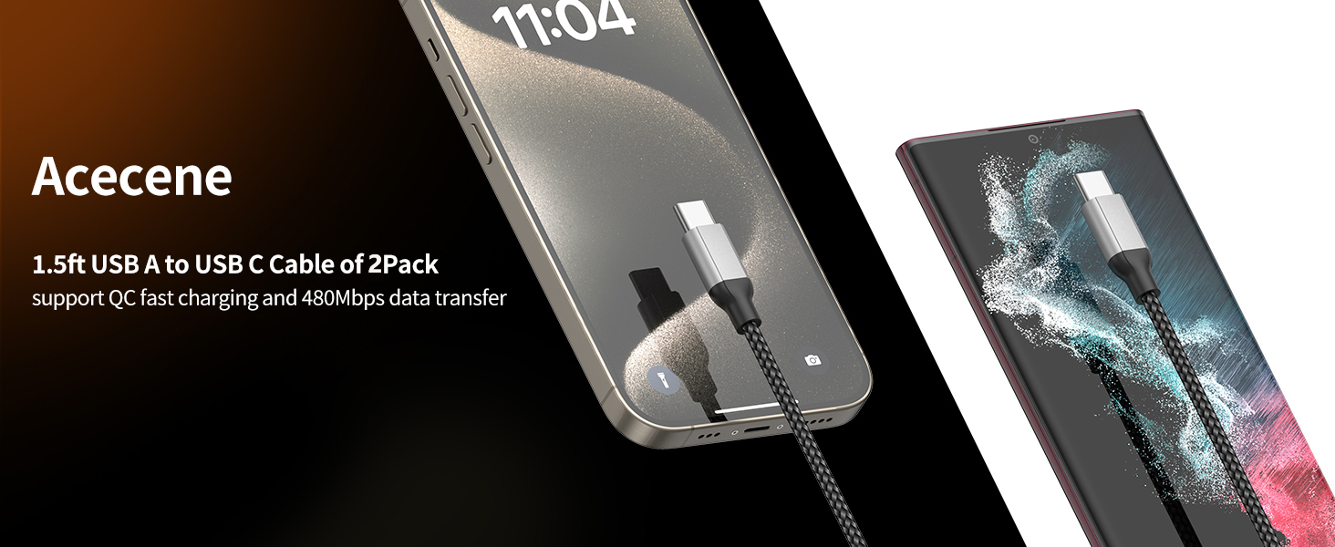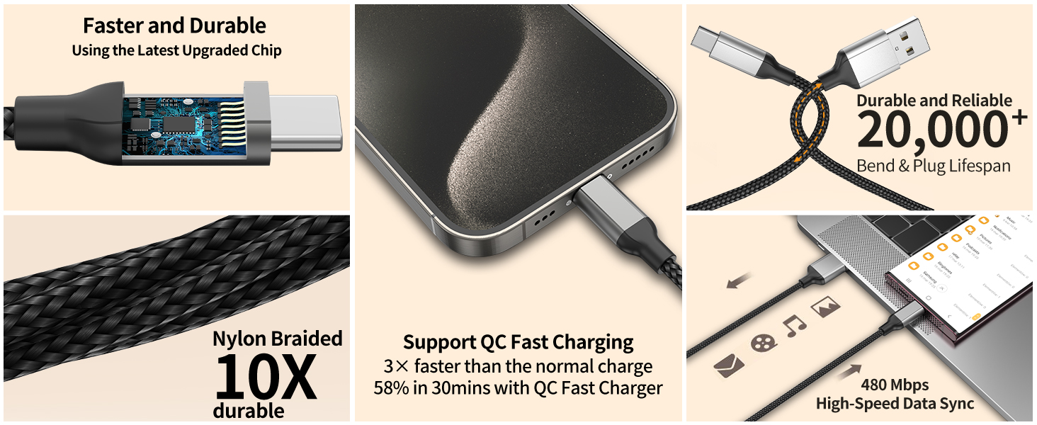 【أكثر متانة】كابل USB A إلى USB C بطول 1.5 قدم مصنوع من سبائك الألومنيوم عالية الجودة ومادة النايلون المتينة. تم اختباره لتحمل الانحناء أكثر من 50000 مرة، مما يجعله أكثر متانة 10 مرات من الكابلات العادية.