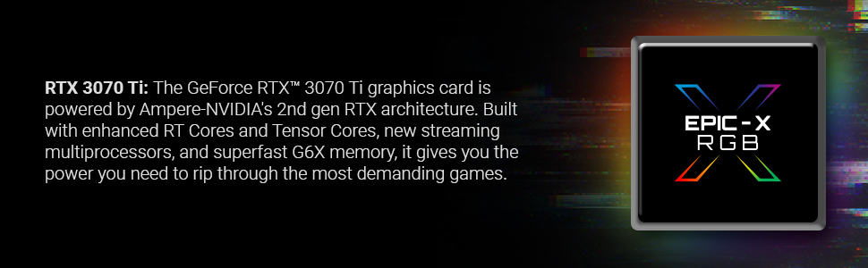 The GeForce RTX™ 3070 Ti is powered by the NVIDIA Ampere architecture. Built with enhanced RT Cores and Tensor Cores, new streaming multiprocessors, and superfast G6X memory, it gives you the power you need to rip through the most demanding games. The all-new NVIDIA Ampere architecture features new 2nd generation Ray Tracing Cores and 3rd generation Tensor Cores with greater throughput. The NVIDIA Ampere streaming multiprocessors are the building blocks for the world's fastest, most efficient GPU for gamers and creators. GeForce RTX™ 30 Series GPUs are powered by NVIDIA's 2nd gen RTX architecture, delivering the ultimate performance, ray-traced graphics, and AI acceleration for gamers and creators. EPIC-X RGB™ Offers brilliant RGB design combined with ultimate performance, taking your PC to the next level. Not only can you destroy the competition, but your system can look good while doing so.