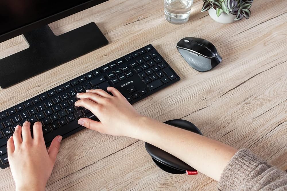 The innovative CHERRY SLIDEPAD ERGO optimises the position of the wrist and forearm, which reduces pain when working with your mouse and keyboard. Although your arm rests comfortably in the padded support surface, you still enjoy complete freedom of movement. There is no need to raise your arm when switching from mouse to keyboard. Instead, just glide back and forth effortlessly.